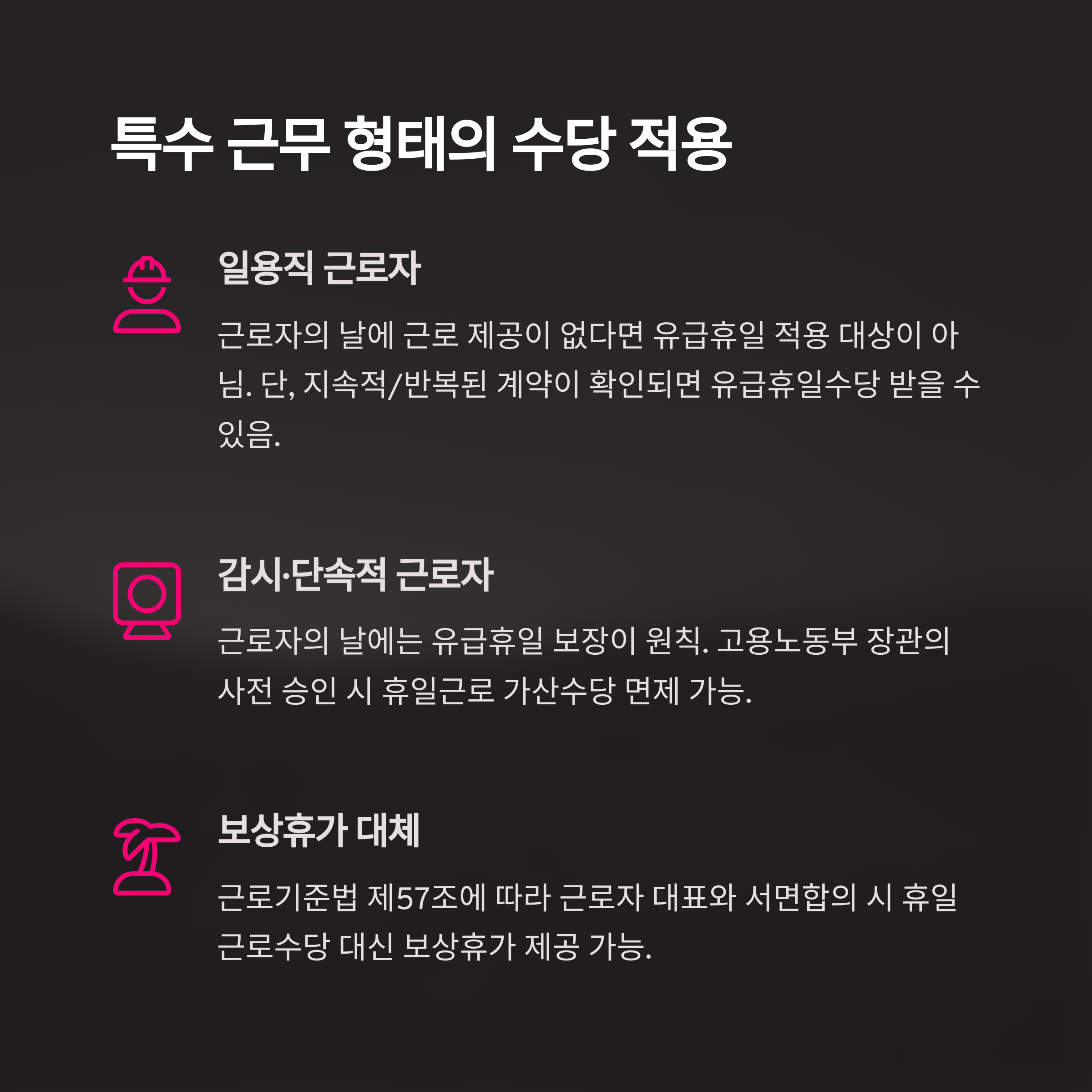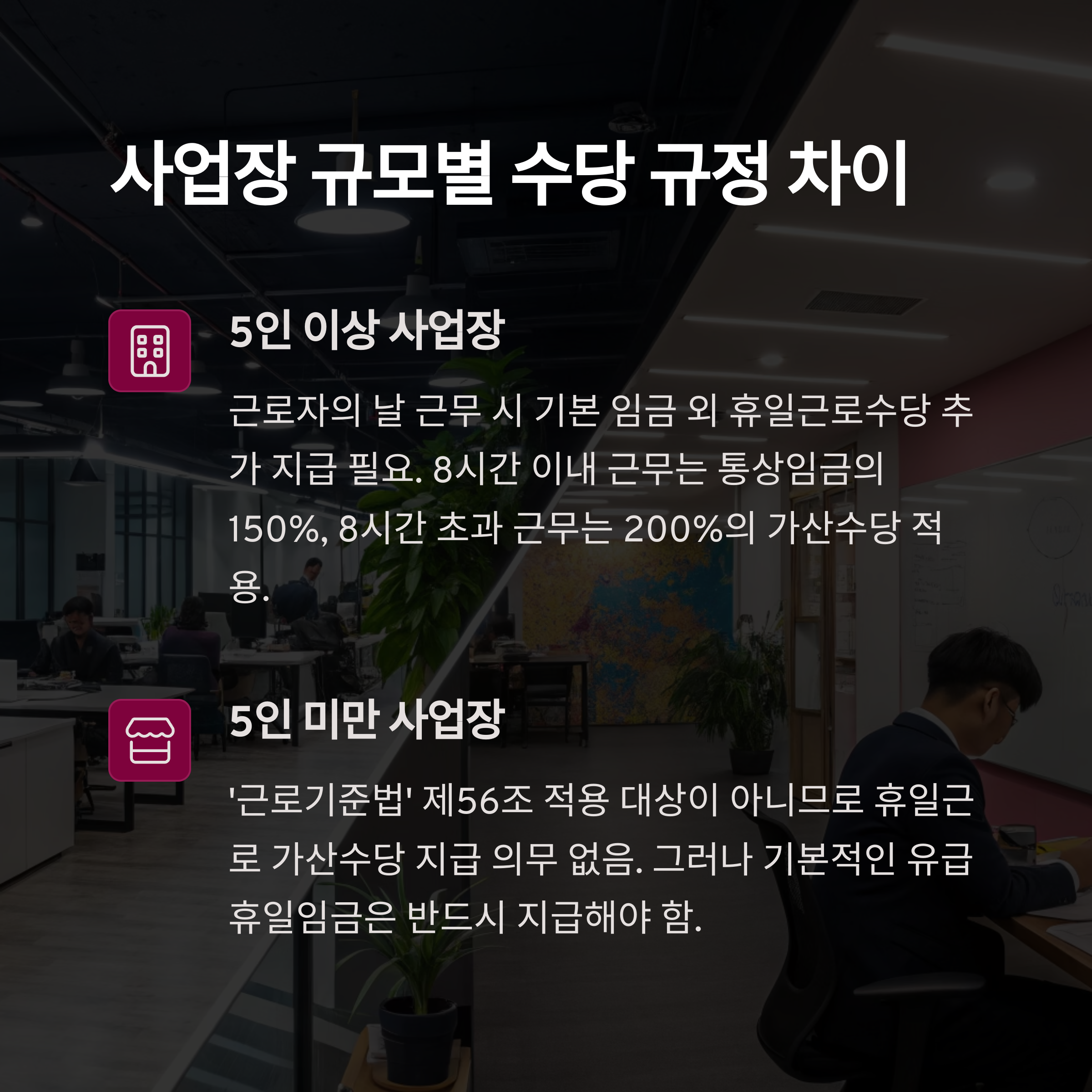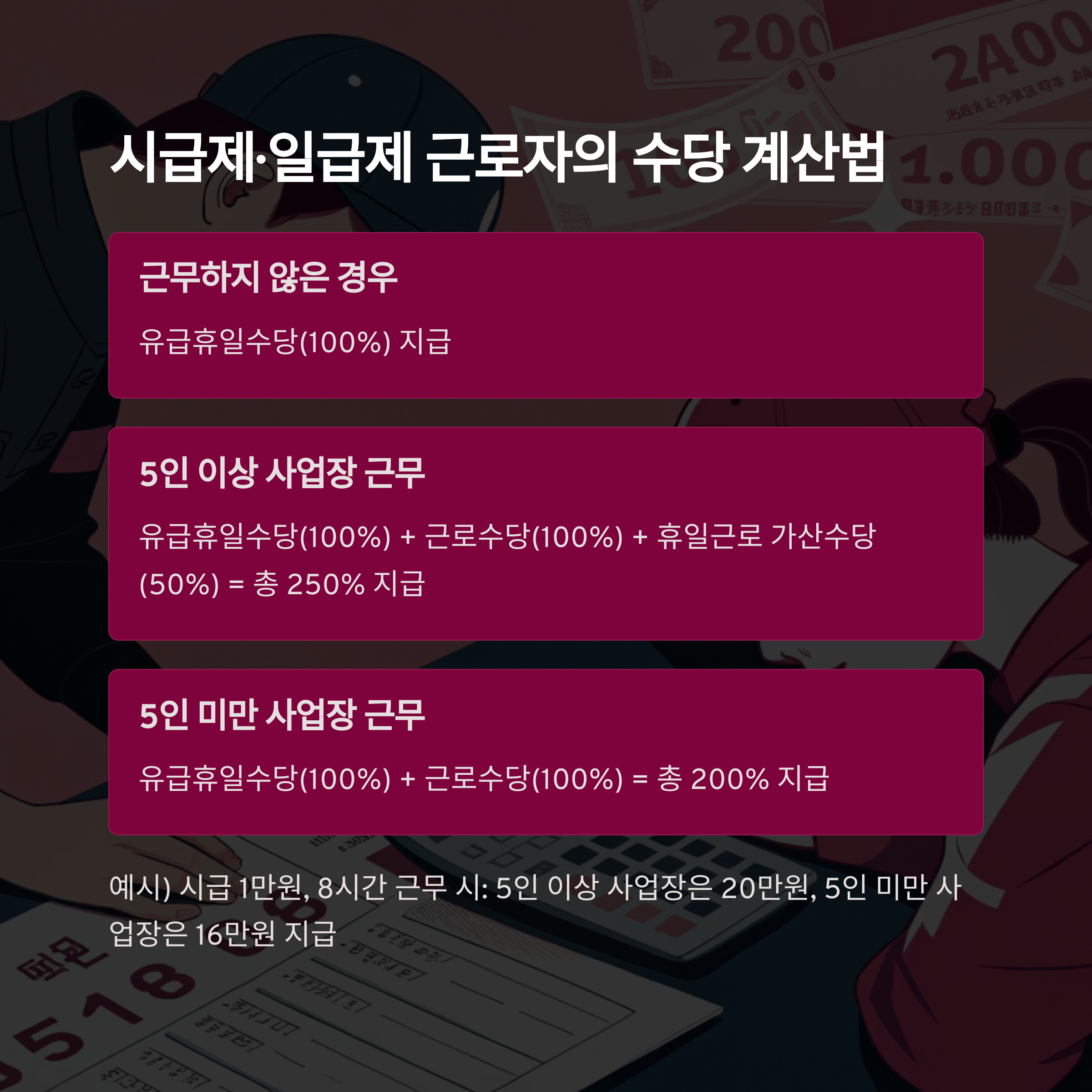 - 5인 이상: 유급휴일수당(100%) + 근로수당(100%) + 휴일근로 가산수당(50%) = 총 250% 지급