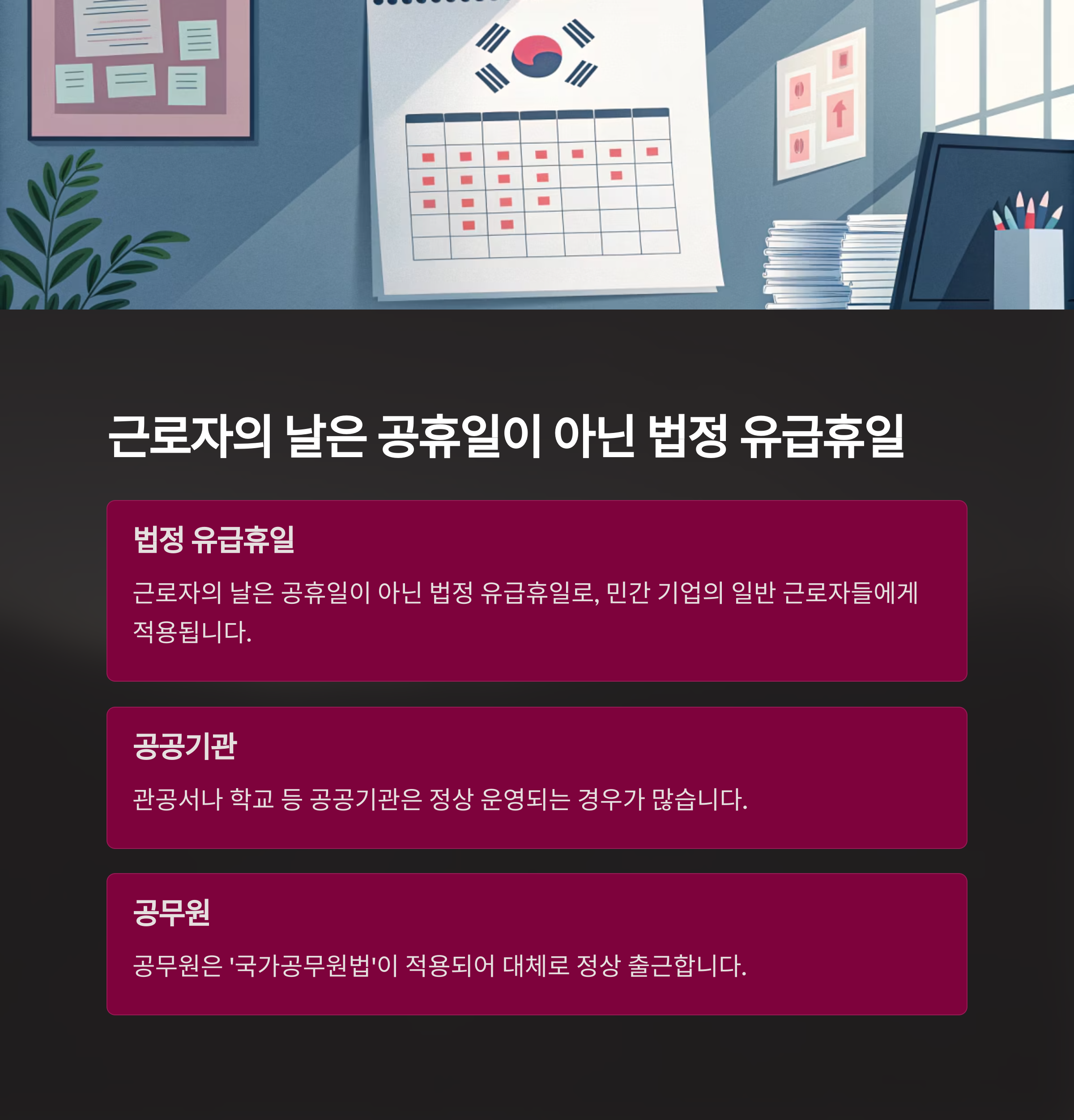 많은 분들이 착각하는 것 중 하나가 근로자의 날이 공휴일로 지정된 날이라는 오해입니다. 실제로는 ‘공휴일’이 아닌 법정 유급휴일입니다. 즉, 민간 기업의 일반 근로자들에게는 유급휴일로 적용되며, 관공서나 학교 등 공공기관은 정상 운영되는 경우가 많습니다. 공무원의 경우는 ‘근로기준법’이 아닌 ‘국가공무원법’이 적용되기 때문에, 근로자의 날이라 하더라도 대체로 정상 출근하게 됩니다.