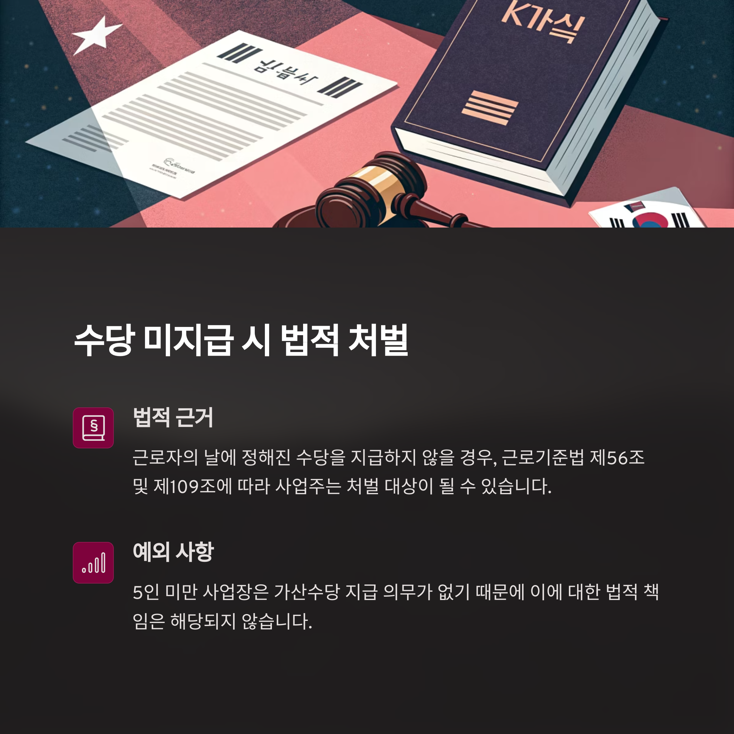 근로자의 날에 정해진 수당을 지급하지 않을 경우, 근로기준법 제56조 및 제109조에 따라 사업주는 처벌 대상이 될 수 있습니다.