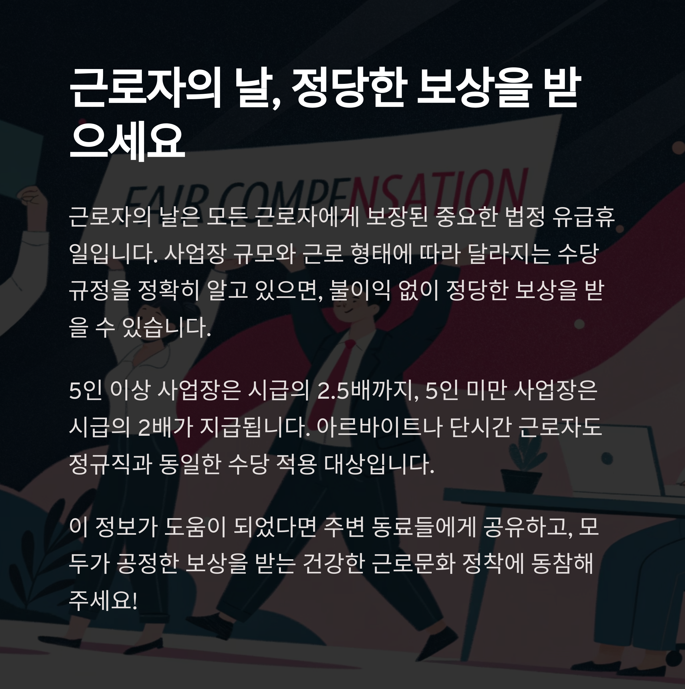 근로자의 날 수당 규정을 정확히 알고 있으면, 불이익 없이 정당한 보상을 받을 수 있으며, 사업주 입장에서도 법적 리스크를 사전에 방지할 수 있습니다.