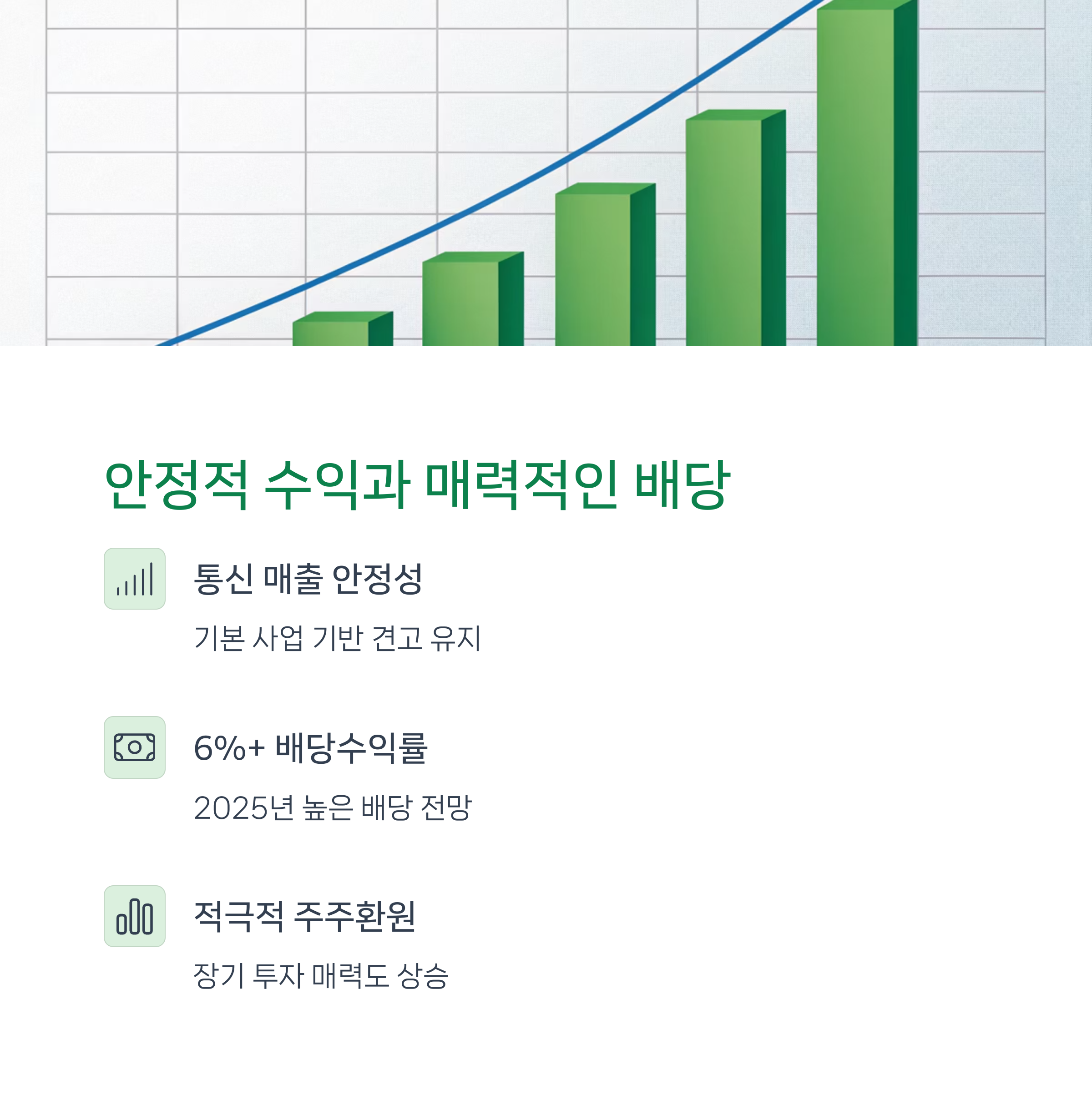 결론적으로 SK텔레콤은 AI 중심의 미래 성장성과 고배당이라는 두 축을 바탕으로 통신주를 넘어 성장주로의 변화를 모색하고 있습니다. 단기적 리스크 요인은 존재하지만, 장기적으로는 긍정적인 주가 흐름을 기대할 수 있는 우량 종목으로 평가됩니다.