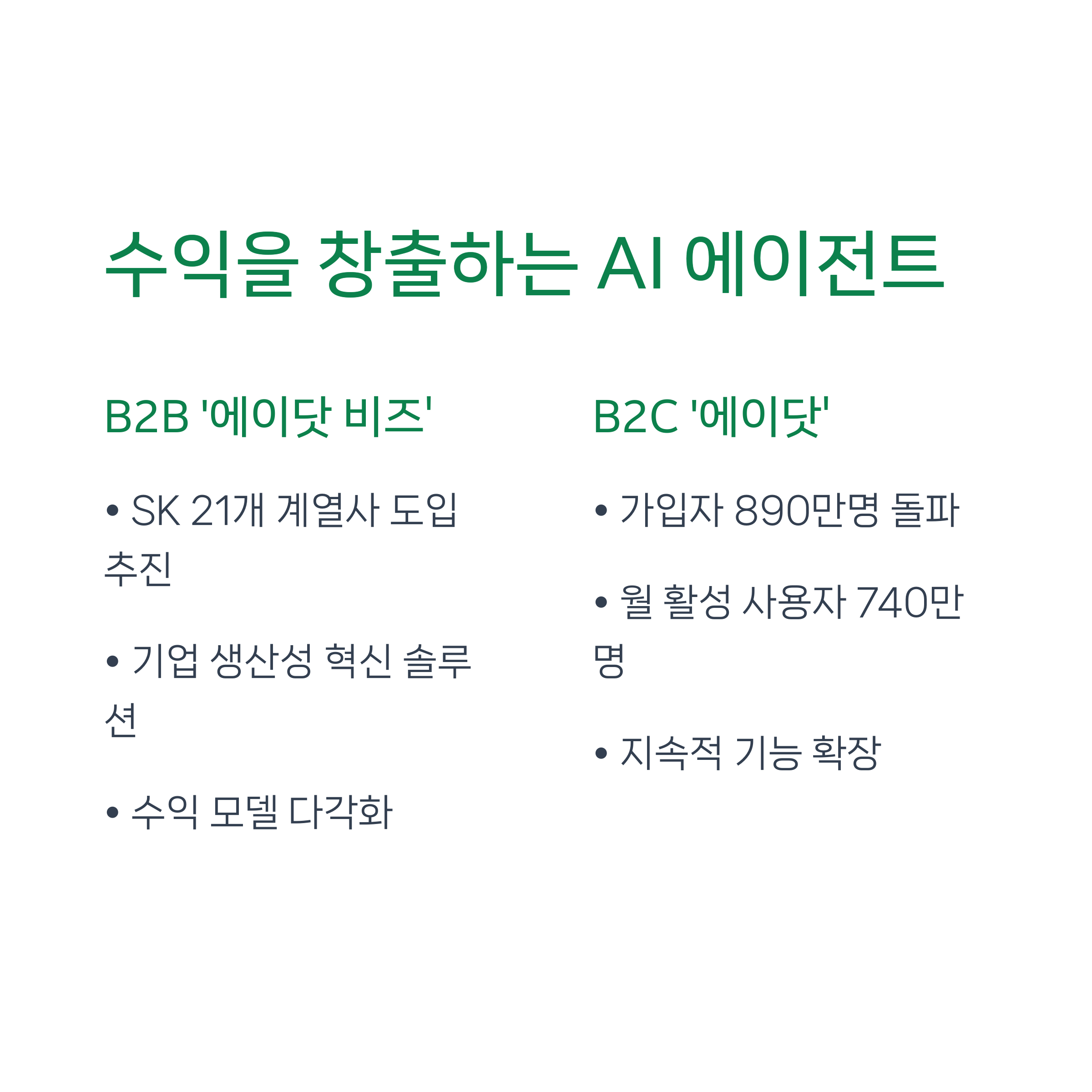 AI 서비스의 대표 사례로는 AI 에이전트 ‘에이닷’이 있으며, 이미 890만 명의 가입자를 확보하고 있습니다. 기업용 AI 플랫폼 ‘에이닷 비즈’를 통해 B2B 시장에서도 수익화를 본격화하고 있습니다.