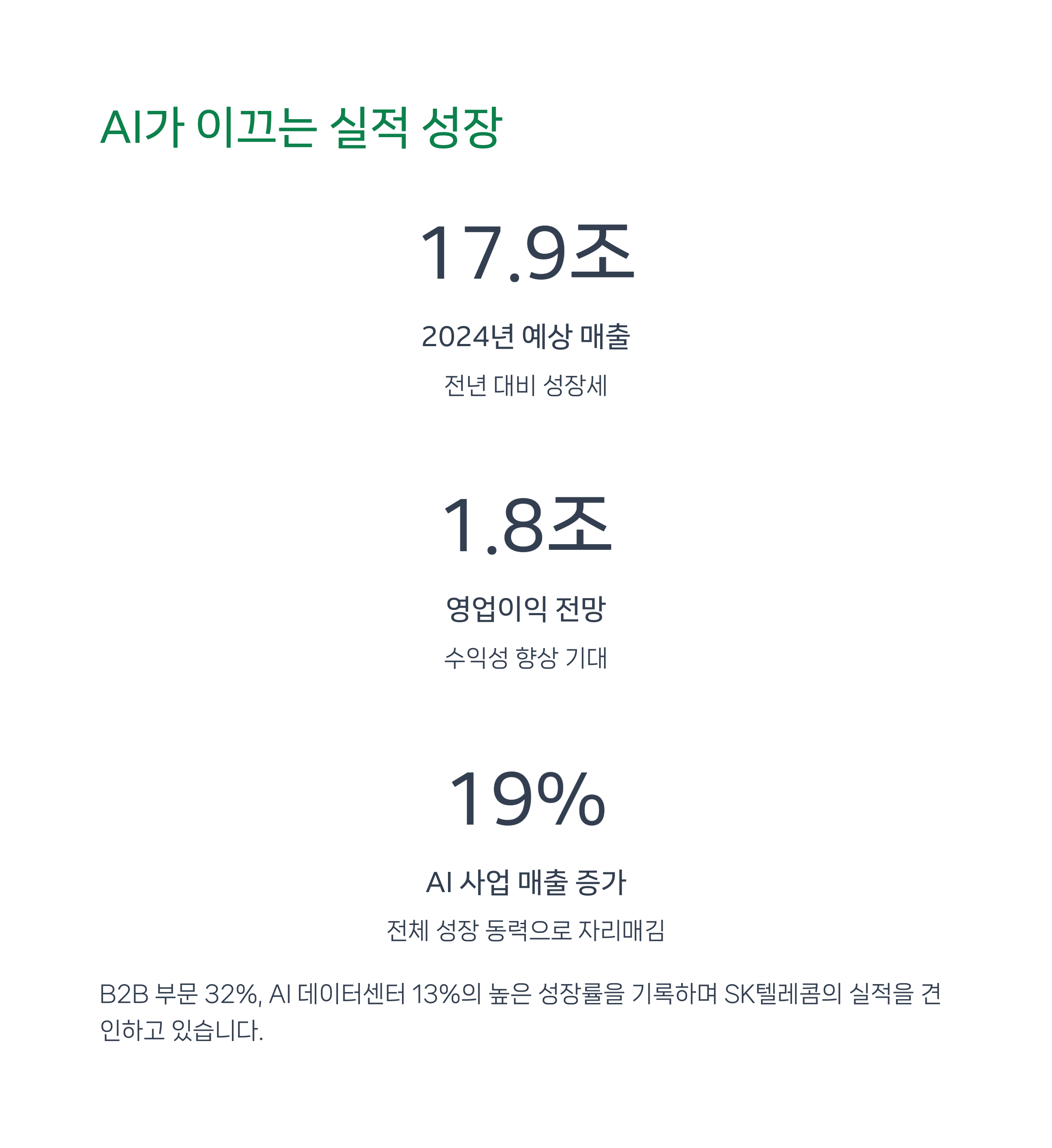 2025년에는 매출 18조2,900억 원(2.0% 증가), 영업이익 2조1,000억 원(9.4% 증가)으로 더 큰 폭의 성장이 기대되고 있습니다. 특히 AI 및 클라우드 사업의 본격적인 수익화가 실적 개선의 핵심 동력으로 분석됩니다.