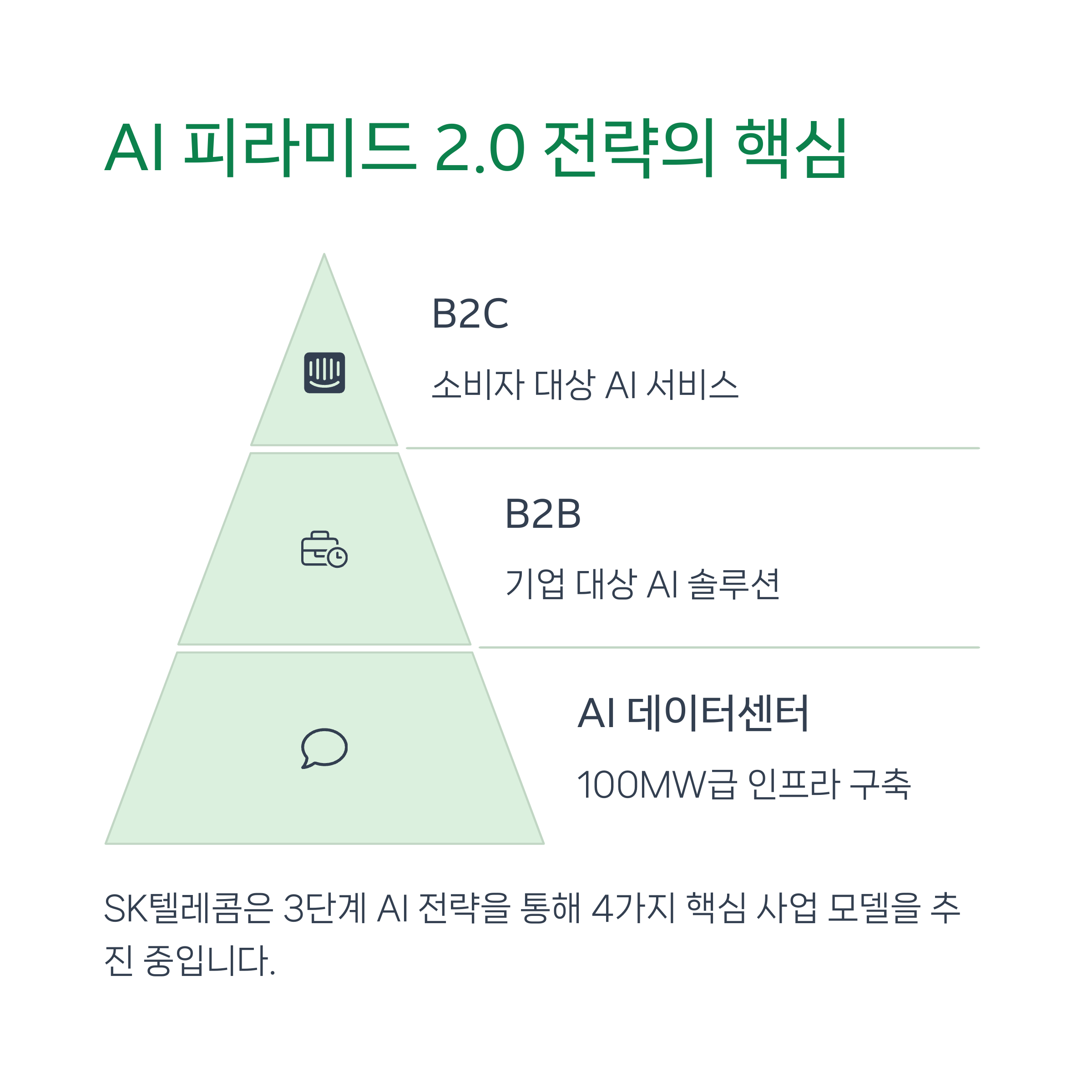 SK텔레콤은 ‘AI 피라미드 전략’을 통해 인공지능을 중심으로 한 3대 영역(인프라, AI 전환, 서비스)을 집중 육성하고 있습니다. 2030년까지 전체 매출의 35%를 AI 기반에서 창출하겠다는 계획 아래, AI 데이터센터(AIDC) 사업을 GPUaaS, 하이퍼스케일 등 4가지 모델로 세분화하며 시장을 선점하고 있습니다.