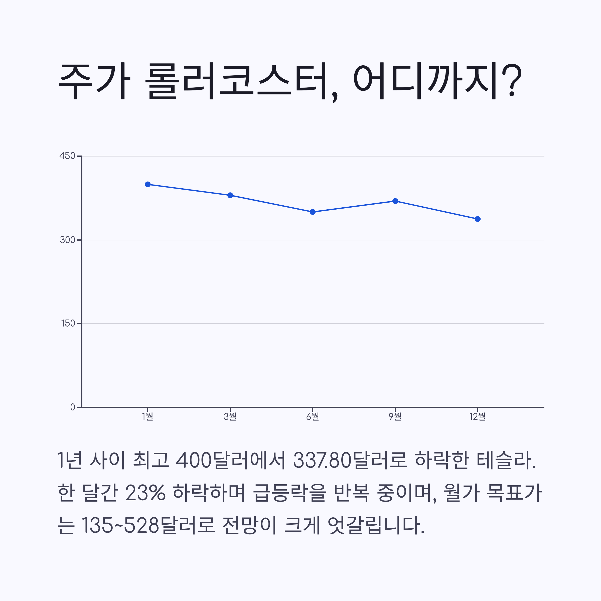 2025년 현재, 테슬라 주가는 복합적인 요인에 의해 요동치고 있습니다. 한때 전기차 시장의 절대 강자로 평가받았던 테슬라는 최근 몇 달간 주가 하락세를 피하지 못했습니다. 그러나 여전히 테슬라 주가 전망에 대해 긍정적인 시선을 보내는 전문가들도 많습니다. 과연 테슬라 주가는 어디로 향할까요? 이 글에서는 테슬라 주가 하락의 원인과 향후 반등 가능성을 종합적으로 살펴보겠습니다.