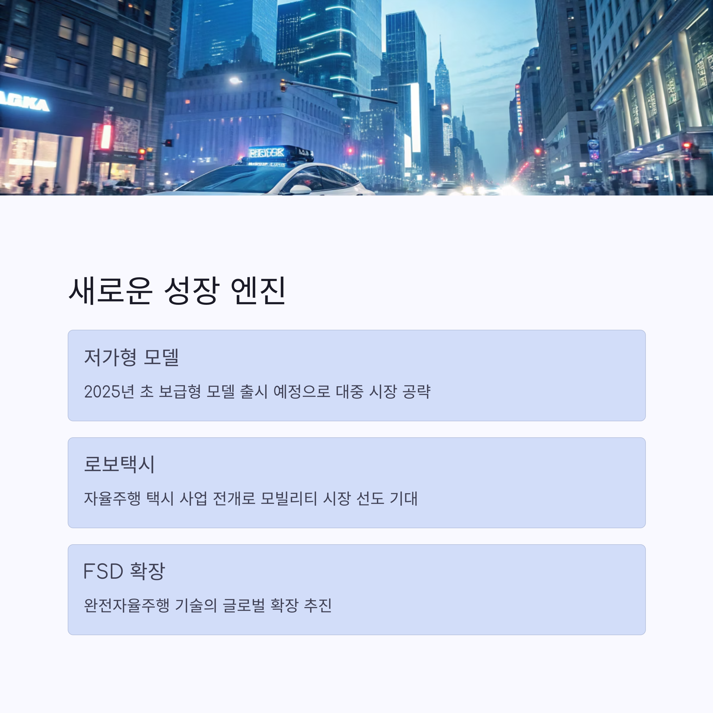 가장 주목받는 것은 테슬라의 로보택시(CyberCab) 출시입니다. 테슬라는 2025년 6월 텍사스 오스틴에서 로보택시 서비스를 시범 운영할 예정입니다. 이 사업은 자율주행 기술을 기반으로 한 새로운 수익 모델을 창출할 것으로 기대되고 있습니다.