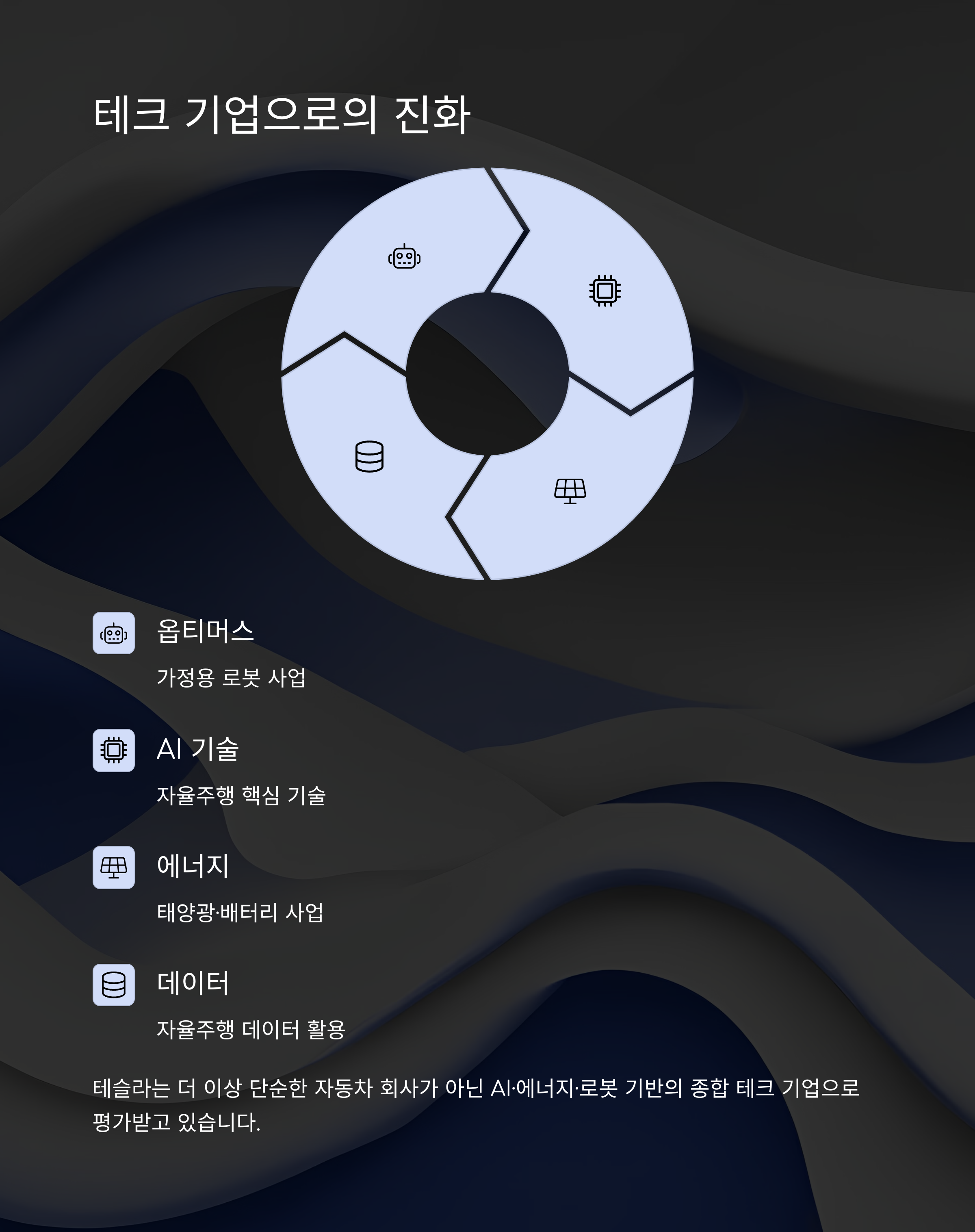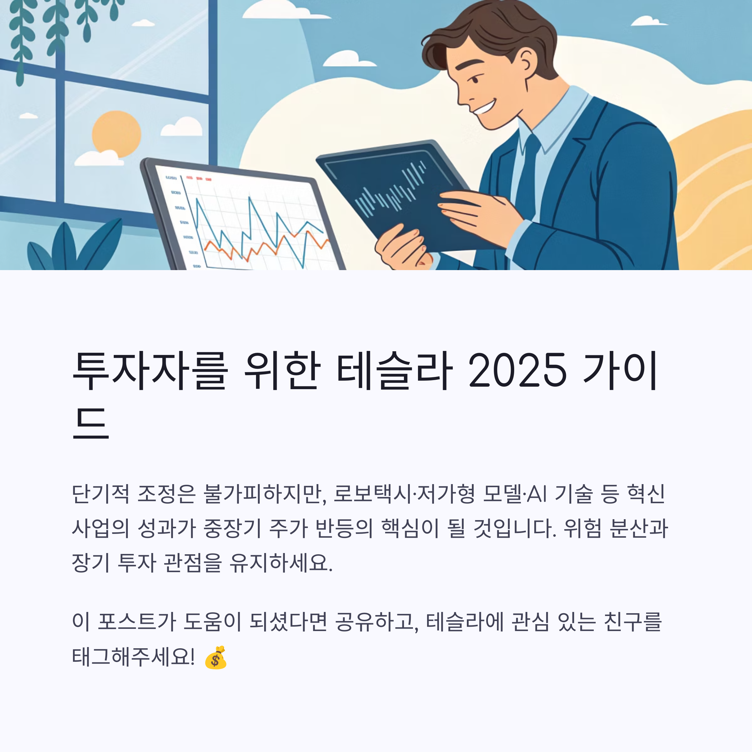 결국 테슬라 주가는 단기적으로는 여러 가지 리스크에 노출되어 있지만, 중장기적으로는 다양한 신사업과 기술 혁신을 통해 반등할 수 있는 가능성을 충분히 보유하고 있다는 평가입니다.