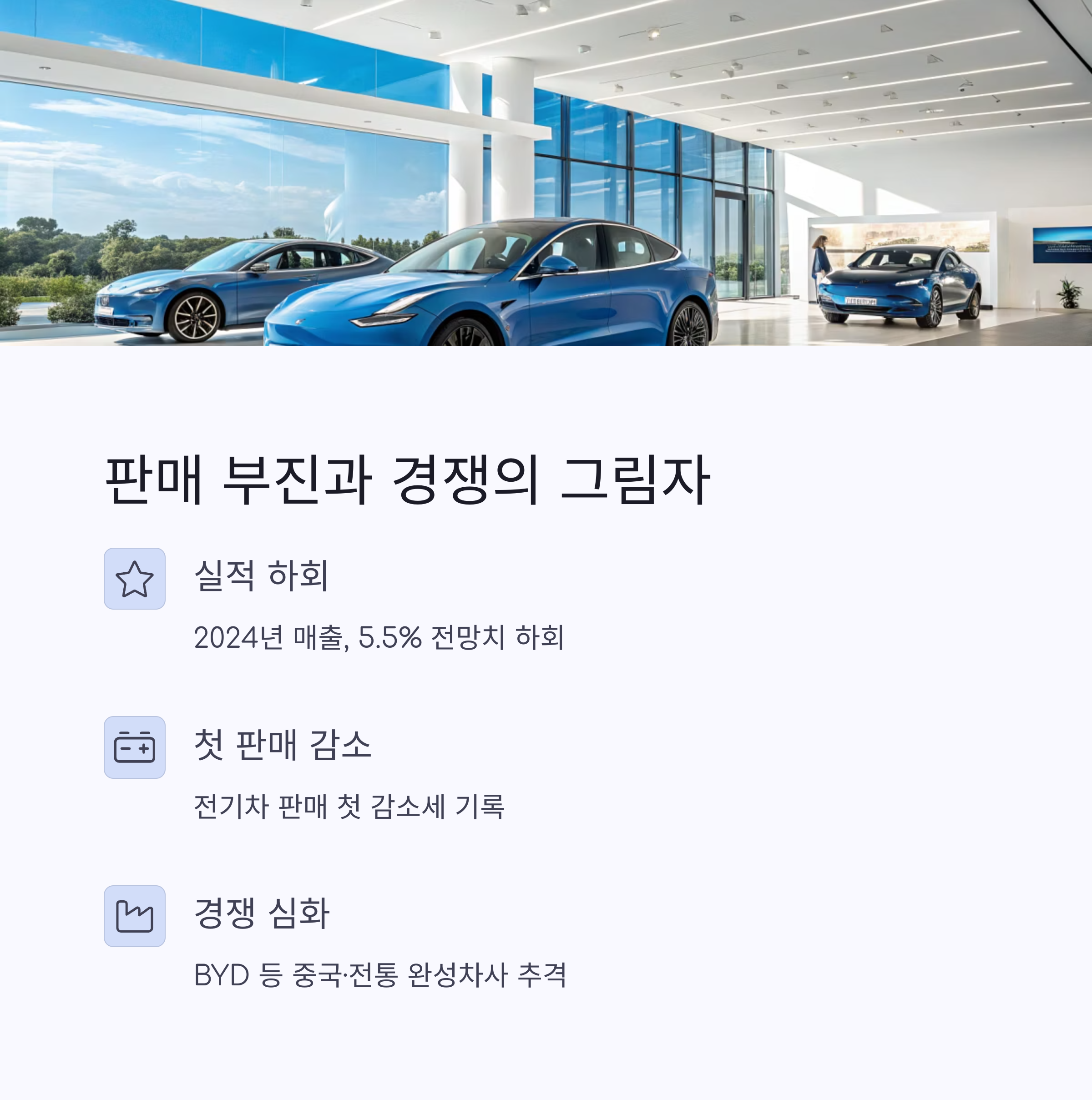 실제로 2025년 1분기 테슬라 차량 출하량은 약 33만 7000대에 그쳐, 지난해 같은 기간보다 13%나 급감했습니다. 이는 시장 예상치를 크게 하회하는 수치로, 테슬라 주가 하락을 부추기는 요인이 됐습니다.