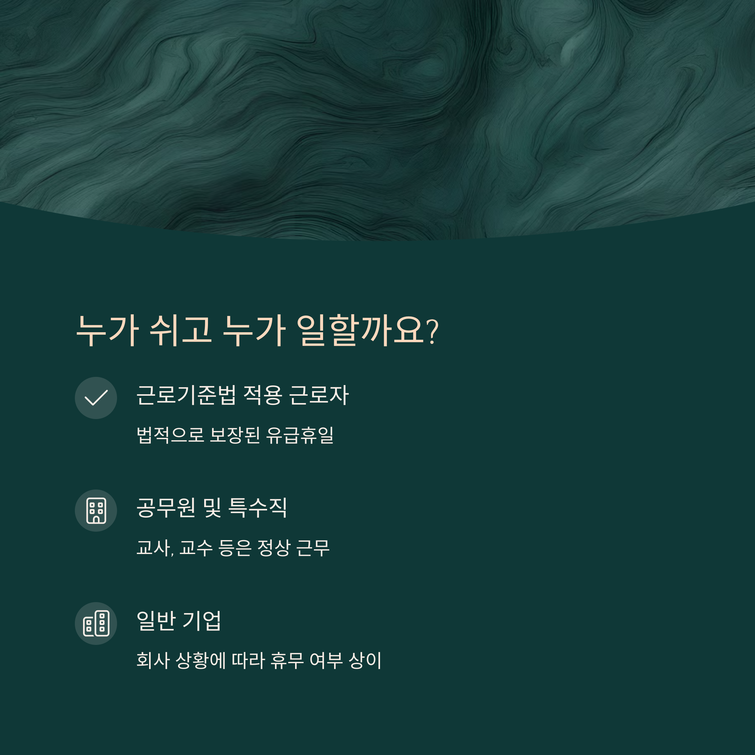 근로자의 날은 「관공서의 공휴일에 관한 규정」에 포함되지 않으며, '법정 공휴일'이 아닌 '법정 휴일'입니다. 이는 곧 공무원이나 교직원, 특수고용직 등은 적용 대상이 아니며, 5인 이상 사업장에 근무하는 근로자만이 유급휴일로 보장받는다는 의미입니다.