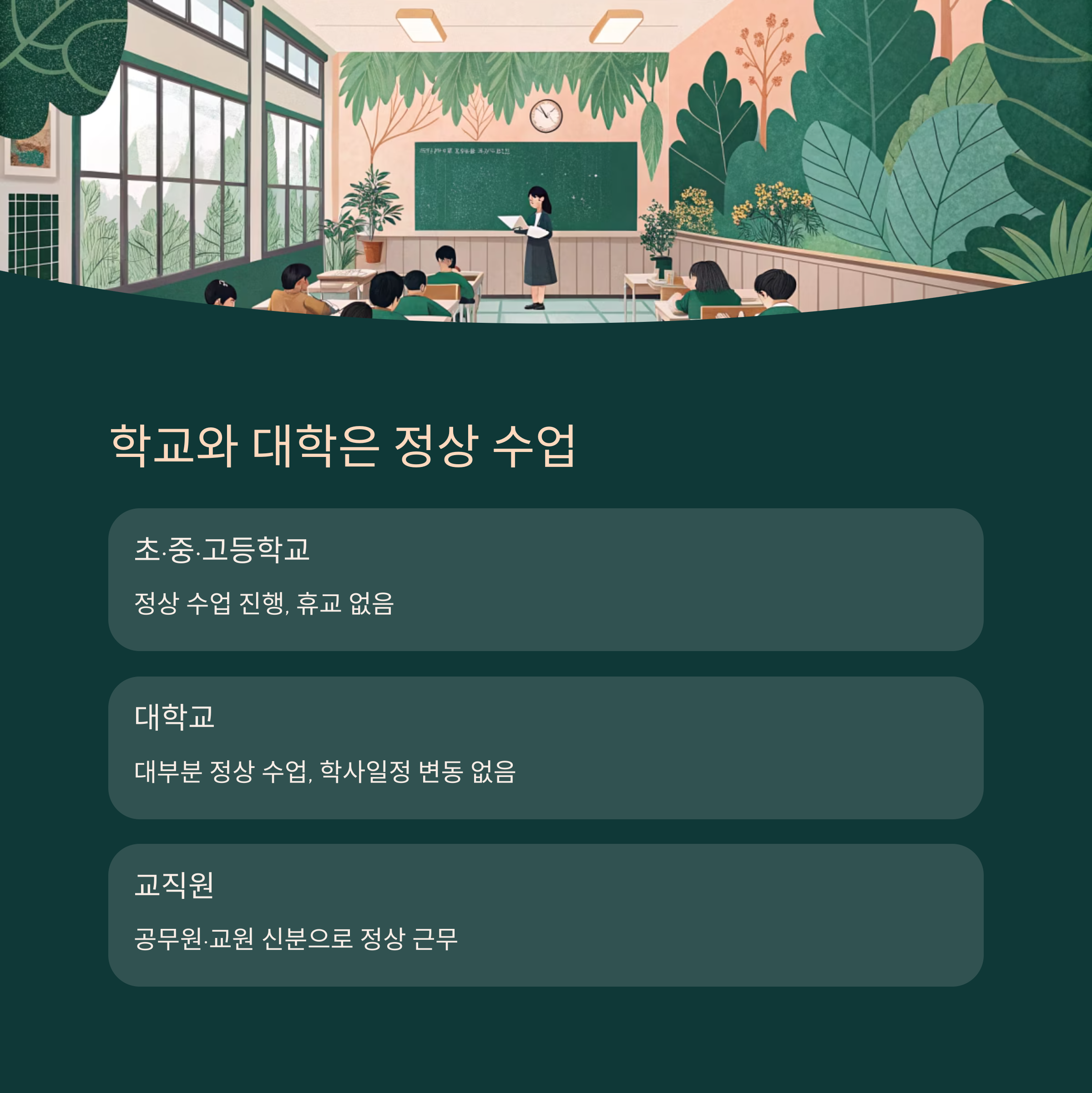 가장 많은 문의 중 하나는 학교 운영입니다. 결론부터 말하자면, 전국의 초·중·고등학교는 정상 수업을 진행합니다. 이는 교사들이 '근로기준법' 적용 대상이 아니고, 학생 또한 근로자가 아니기 때문입니다.