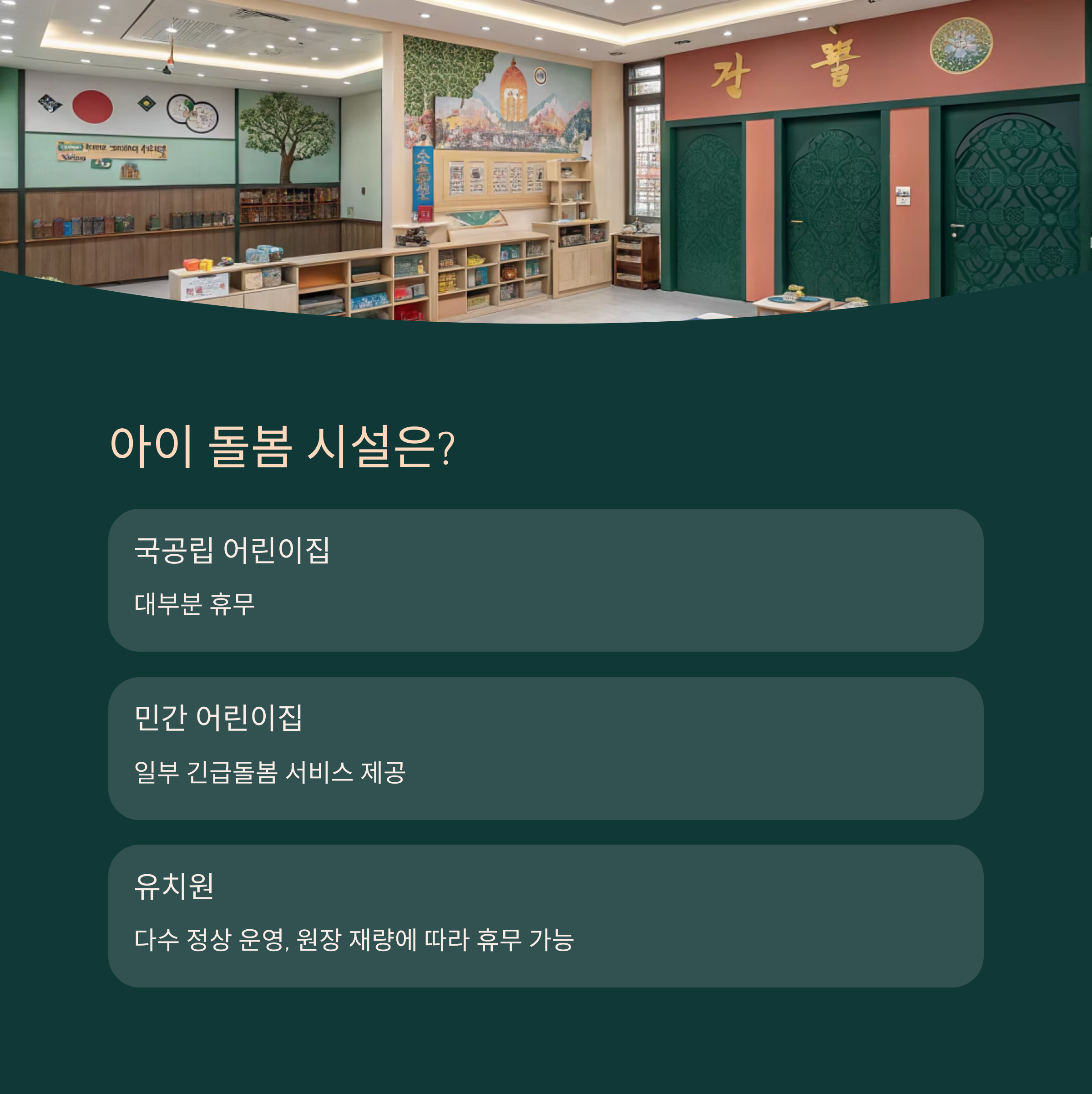 한편, 민간 어린이집의 약 40%는 부분 운영합니다. 오전 반일제나 긴급돌봄 서비스를 제공하며, 이 경우 보육교사는 휴일수당+유급휴일수당을 지급받습니다. 다만 부모는 보통 1주일 전까지 등원 여부를 신청해야 하므로 미리미리 준비해두는 것이 현명합니다.