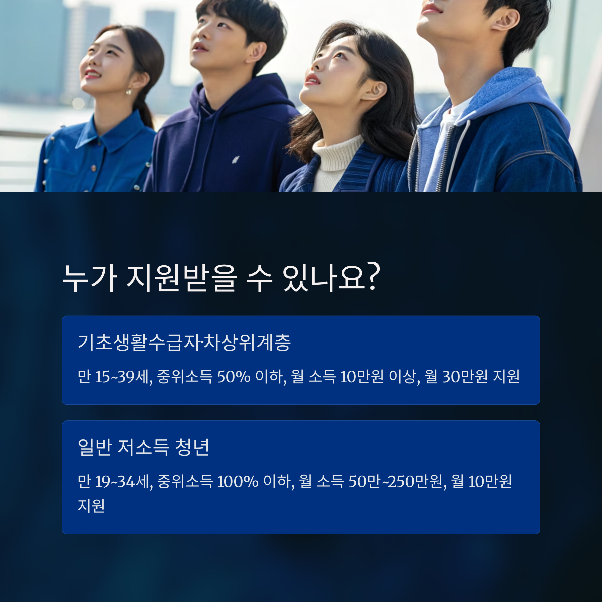 기준 중위소득 50~100%에 해당하는 19세~34세의 일하는 청년이 대상입니다. 기초생활수급자와 차상위계층은 15세~39세까지 신청 가능하며, 이들에게는 더 높은 정부지원금이 지급됩니다.