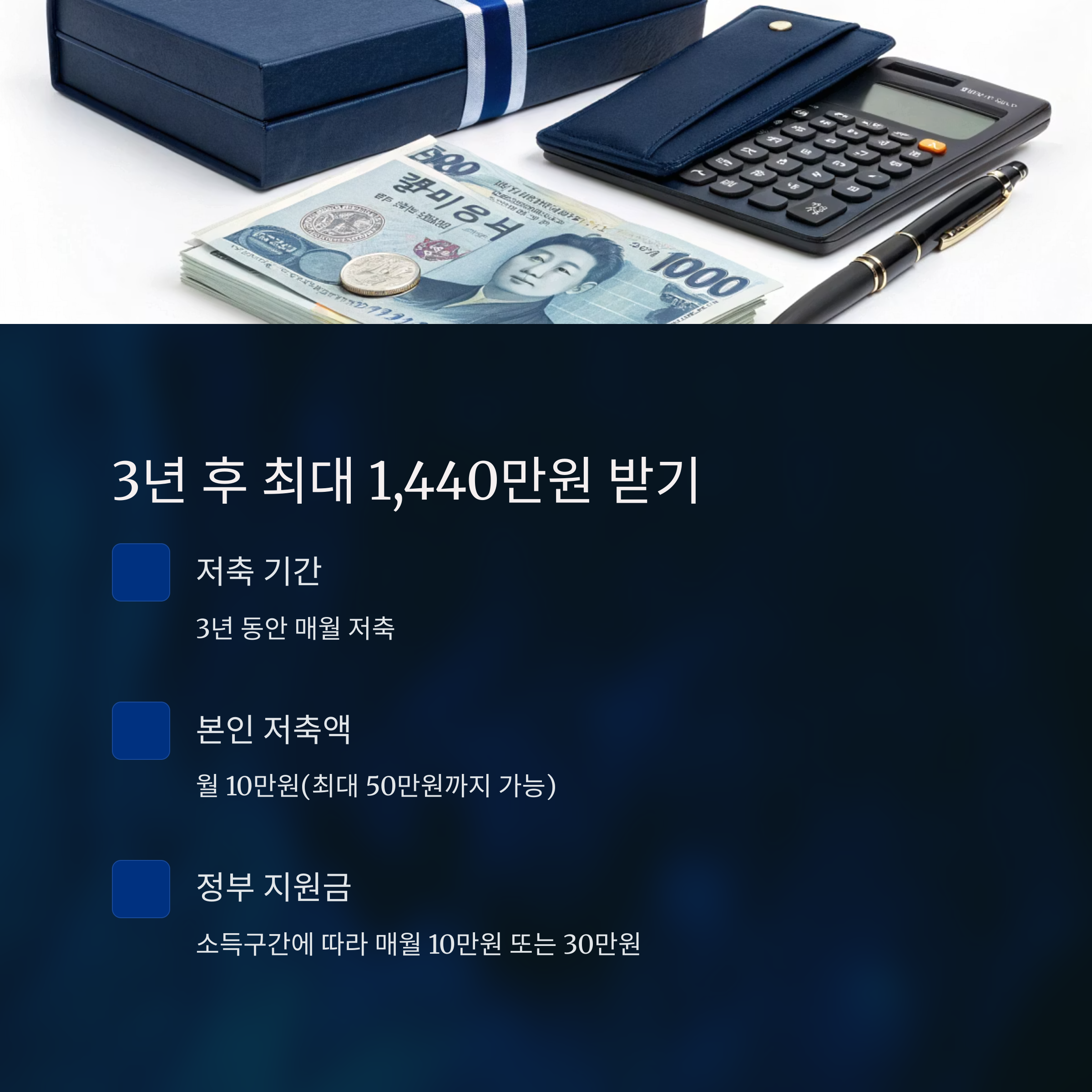 | 구분 | 본인 저축액 | 정부 지원금 | 3년 후 총 수령액 |