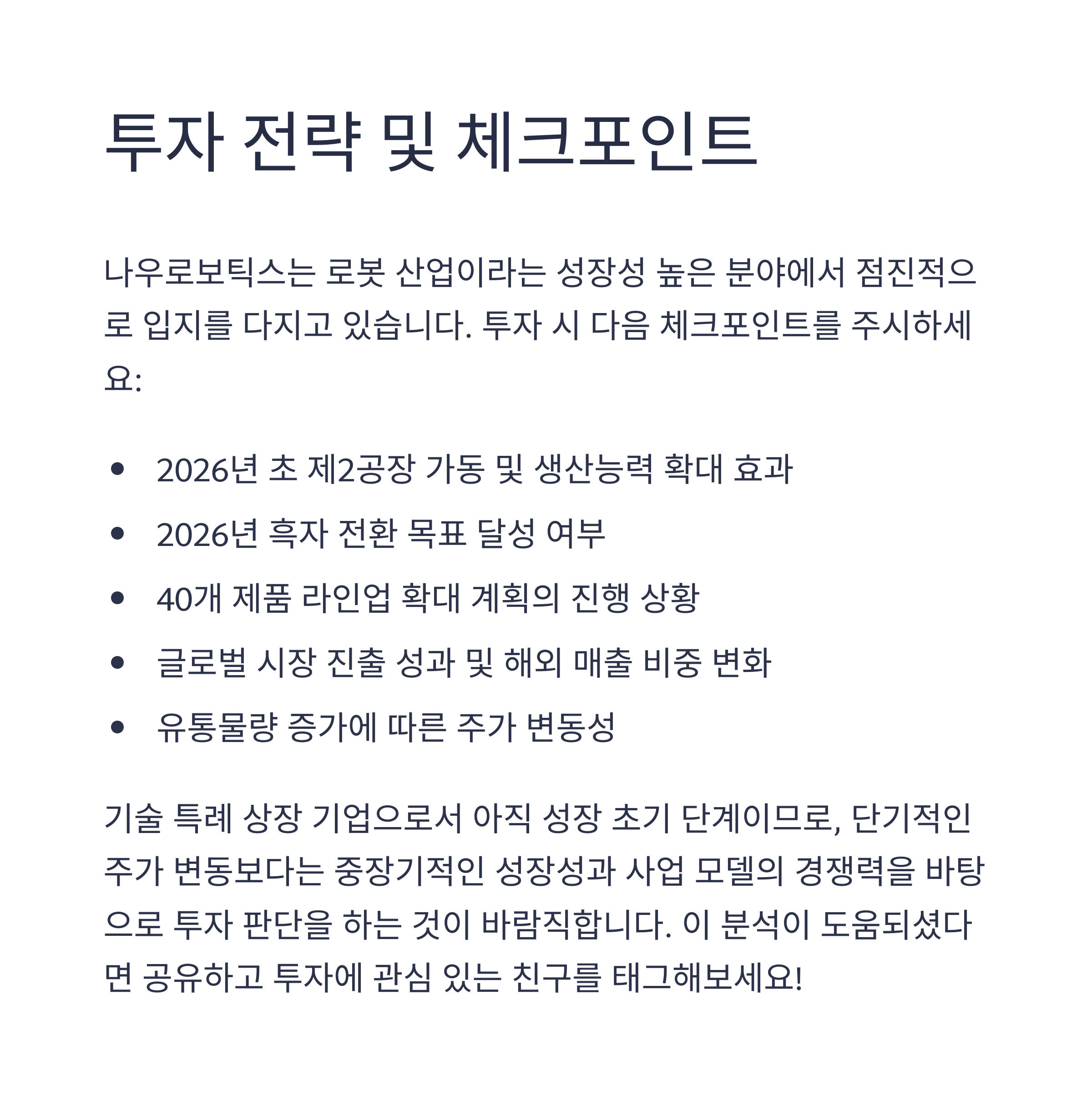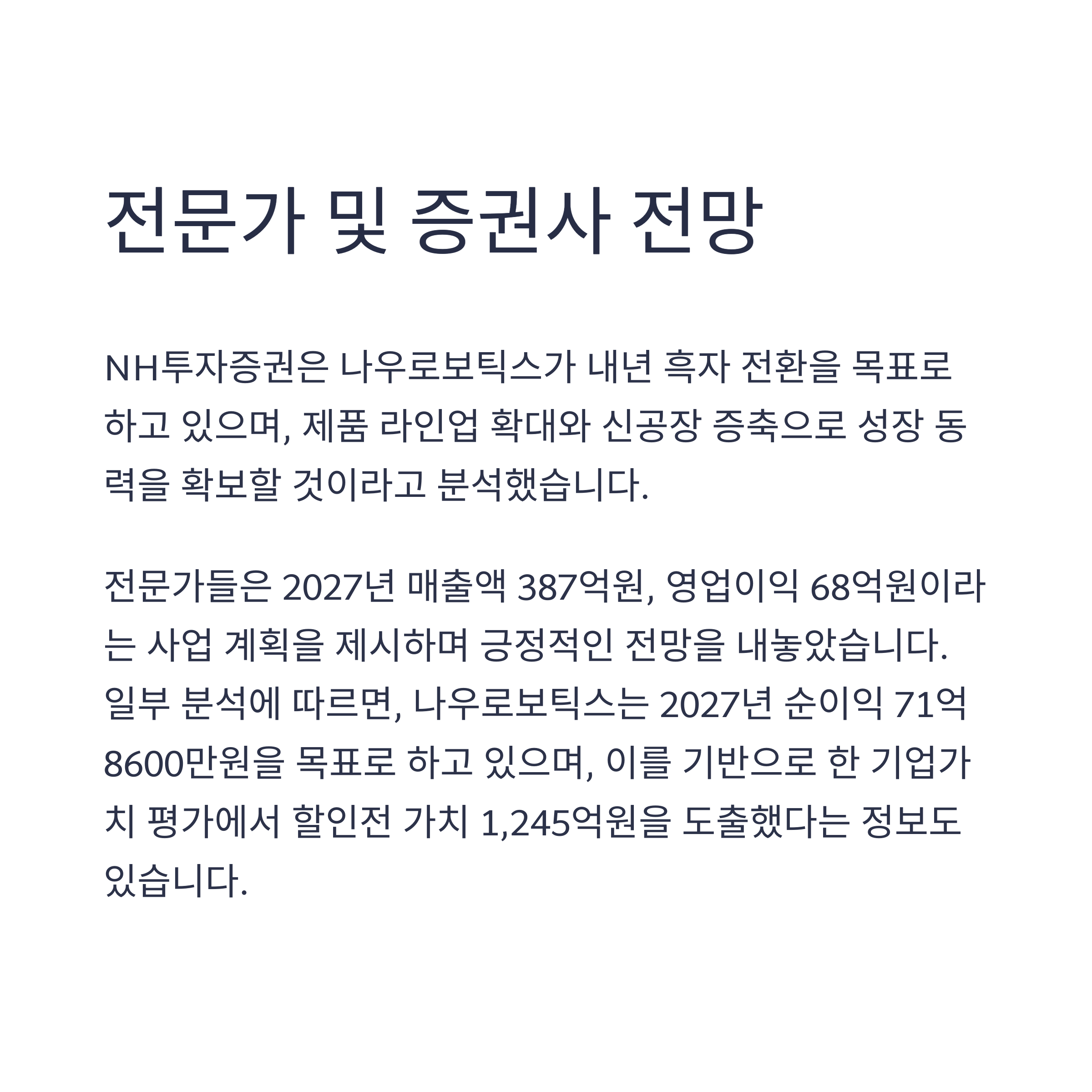 특히, 제2공장과 신공장 라인의 시너지 효과를 강조하며, 나우로보틱스가 기술특례 상장 기업에서 실적 기반 성장 기업으로 전환할 가능성이 높다고 평가했습니다.