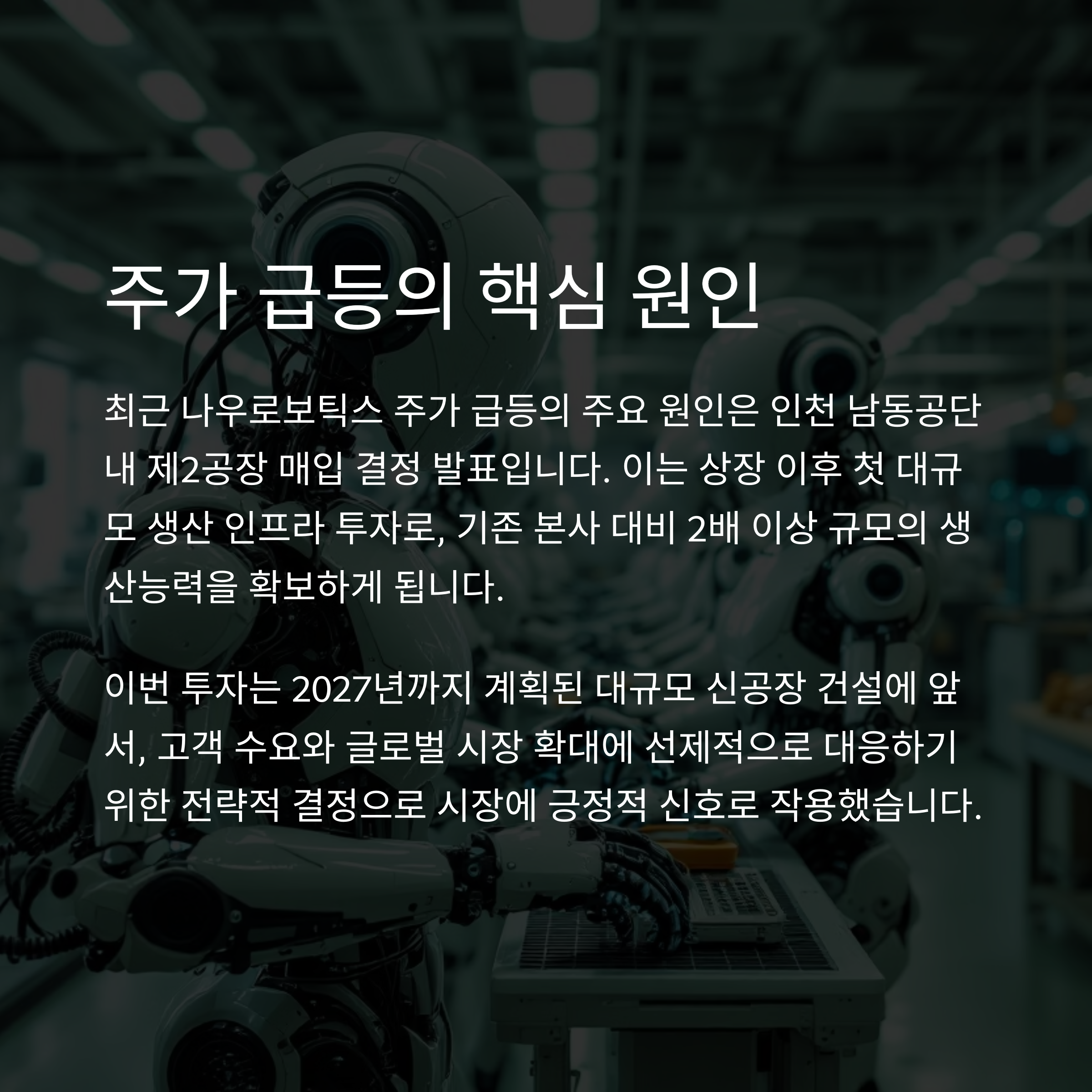 최근 제2공장 매입 소식으로 급등세를 보이고 있는 나우로보틱스의 주가가 향후에도 상승세를 이어갈 수 있을지에 대한 관심이 집중되고 있습니다. 상장 직후 ‘따블’이라는 기록적인 성과를 올린 뒤, 실적 개선과 생산력 확장을 통해 중장기 성장 기반을 다지고 있는 나우로보틱스의 주가 전망을 다각도로 분석합니다.