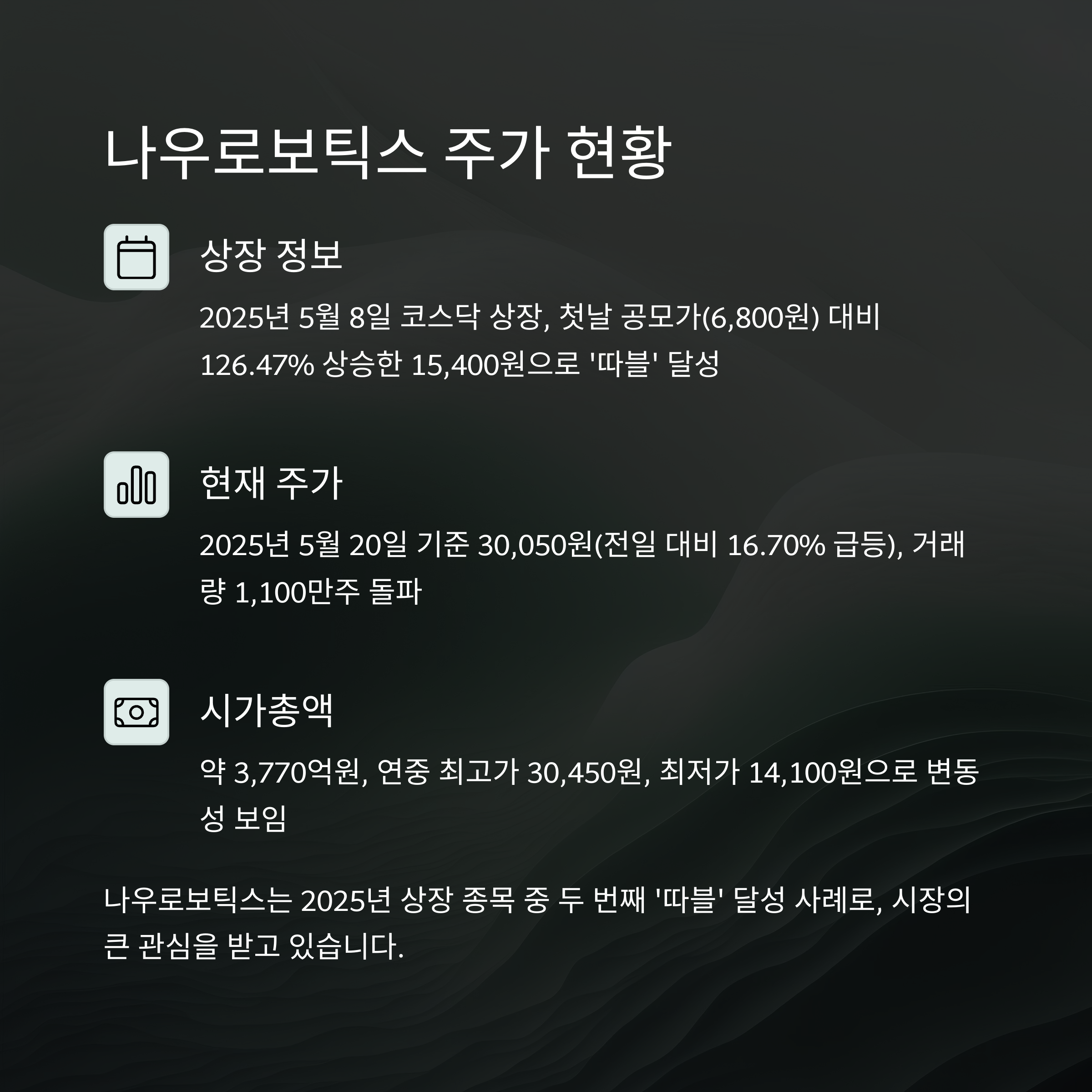 나우로보틱스는 2025년 5월 8일 코스닥 시장에 상장하자마자 공모가의 두 배 이상 상승하며 15,400원에 마감했습니다.