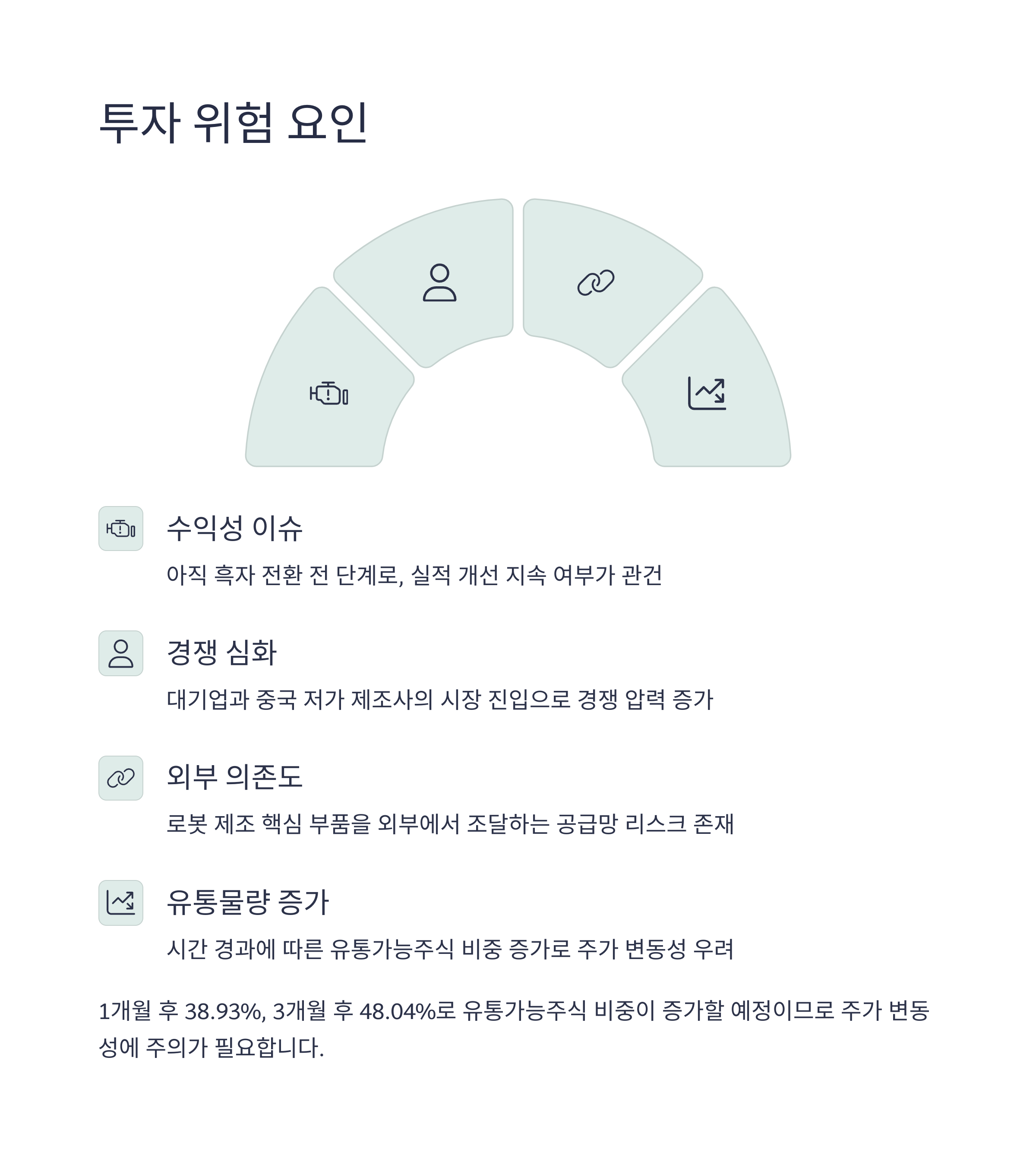 | 공급망 의존 | 핵심 부품 외부 조달, 비용 리스크 |