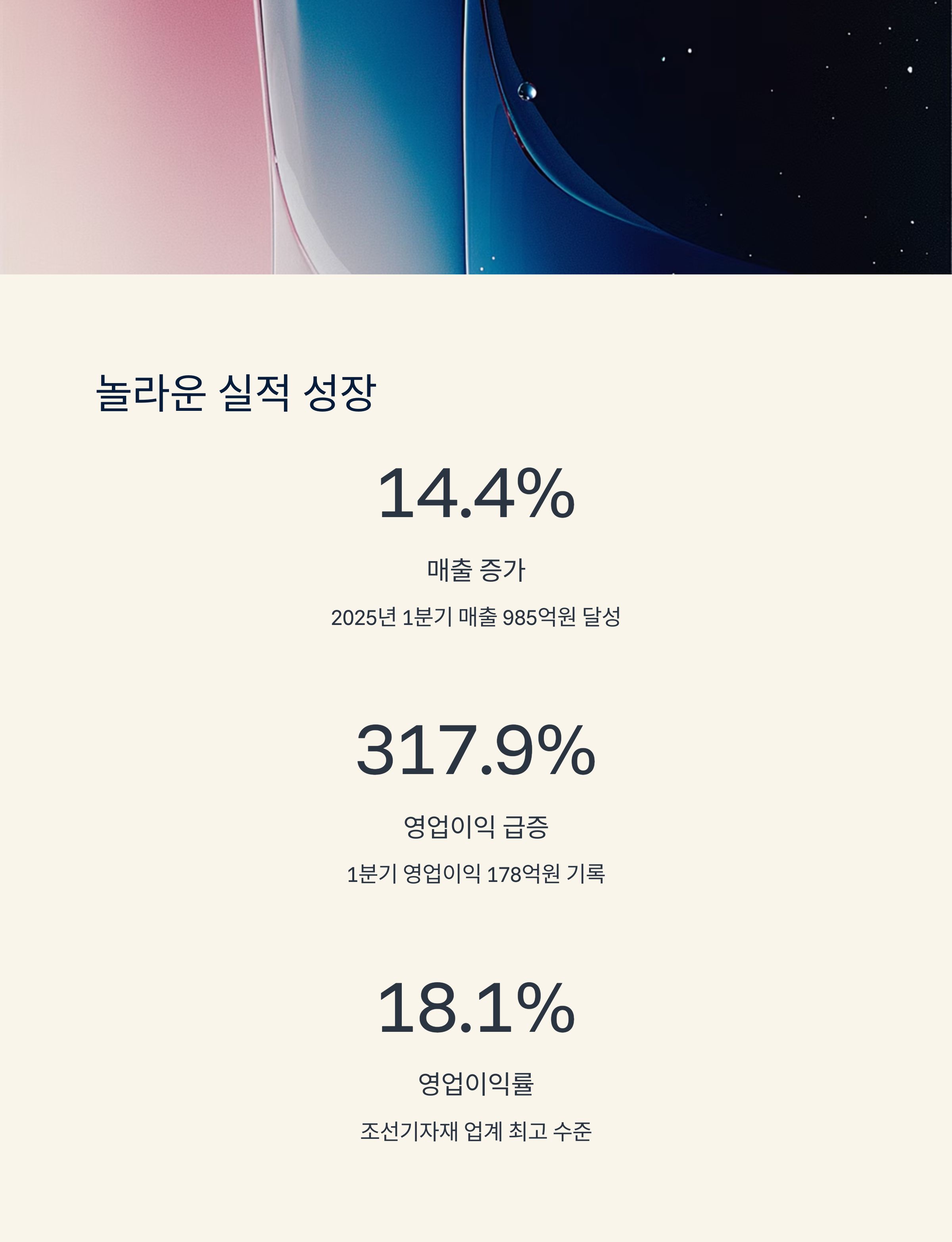 2025년 1분기 세진중공업은 매출 985억 원, 영업이익 178억 원을 기록하며 시장 기대치를 상회하는 실적을 냈습니다.
