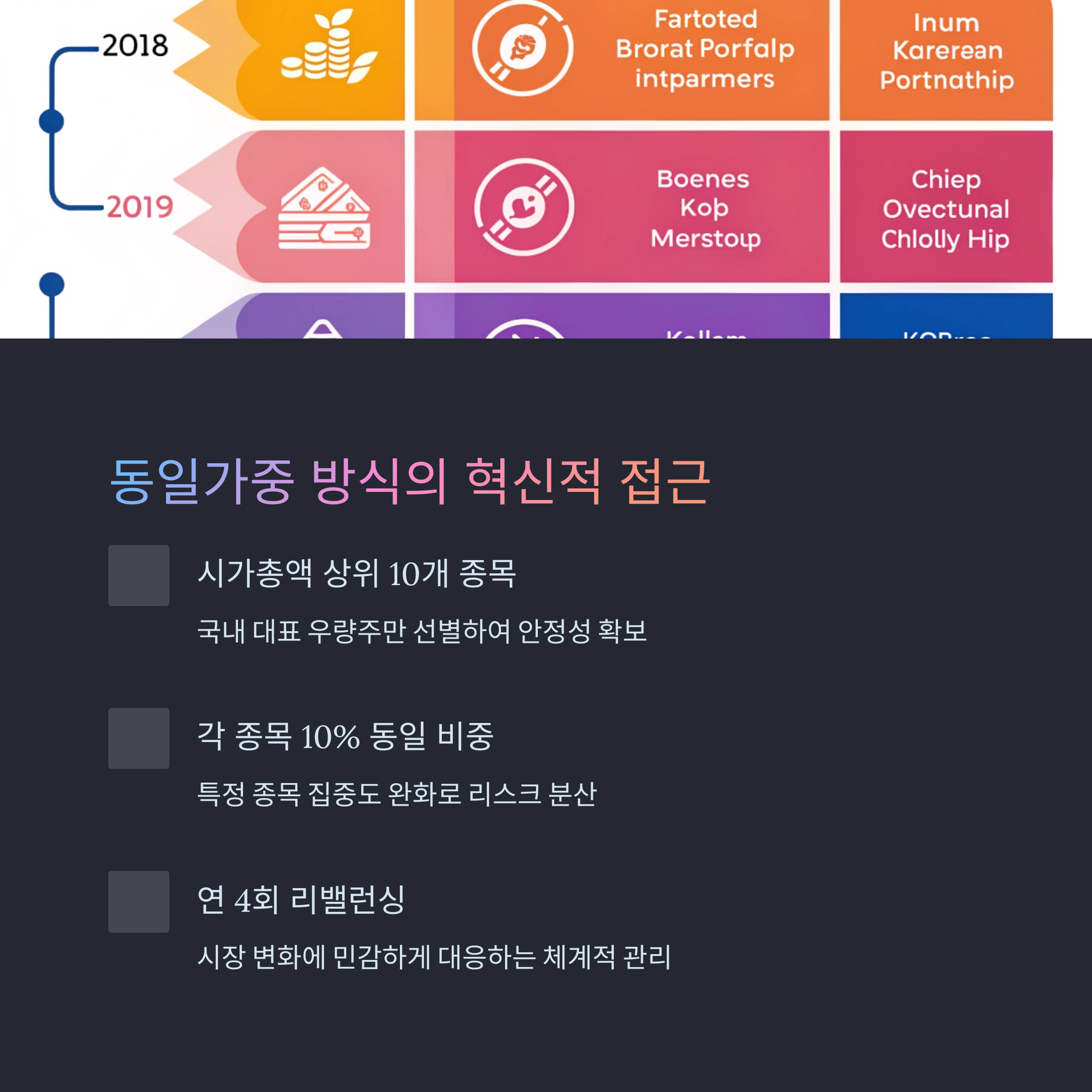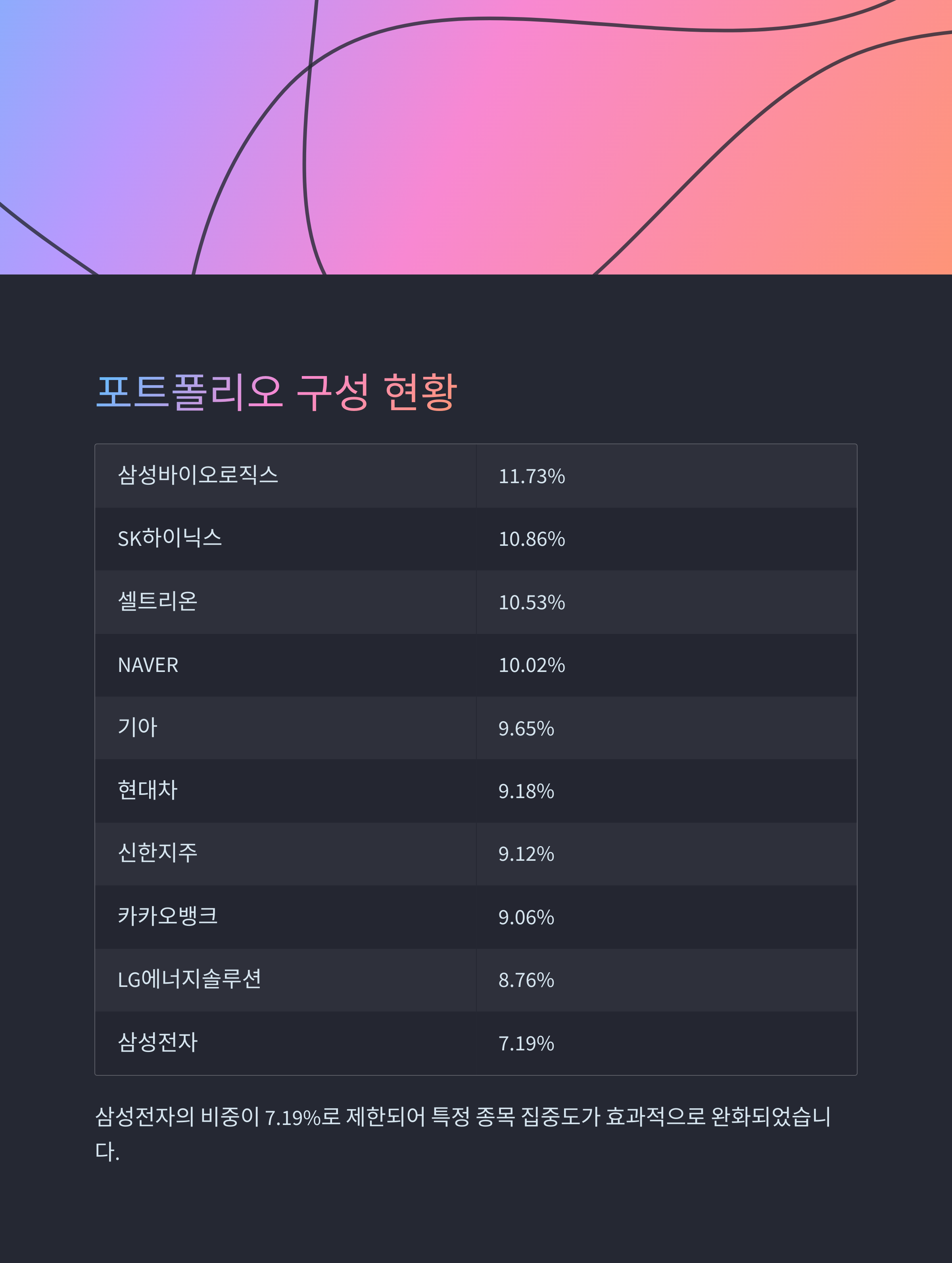 비중은 매번 10%로 동일하게 조절되며, 신규 시총 상위 10종목이 선정될 수 있어 자동 포트폴리오 최적화가 이루어집니다.