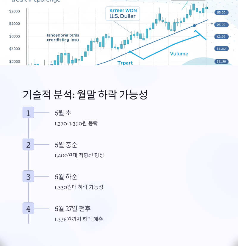 특히 6월 27일 전후로 1,338원까지 하락할 수 있다는 예측도 나와 있으며, 이는 월말에 하향 안정화가 진행될 수 있다는 분석과 일치한다.