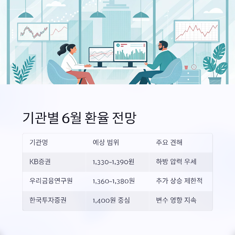 주요 기관들은 6월 환율이 1,330원에서 1,390원 사이에서 등락할 것으로 보고 있다.