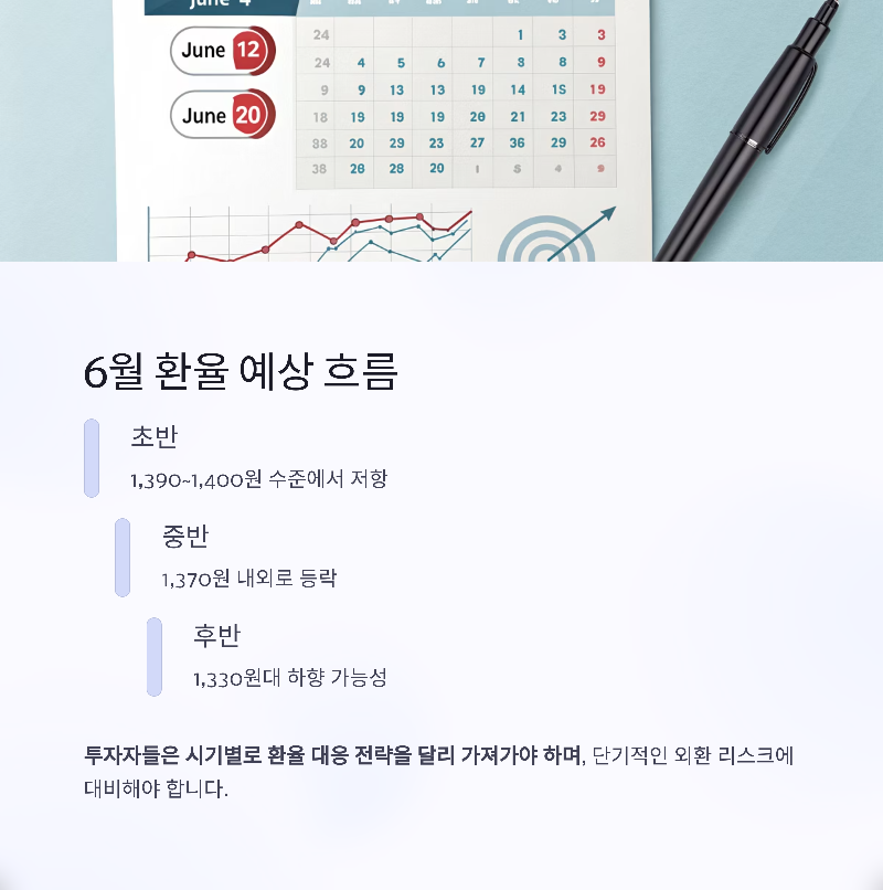 요약하자면, 2025년 6월 원달러 환율은 다음과 같은 흐름이 예상된다: