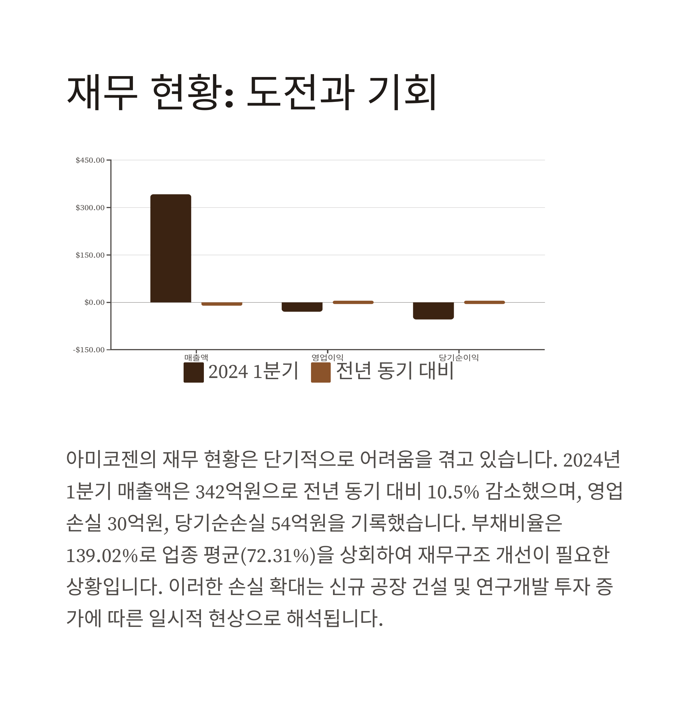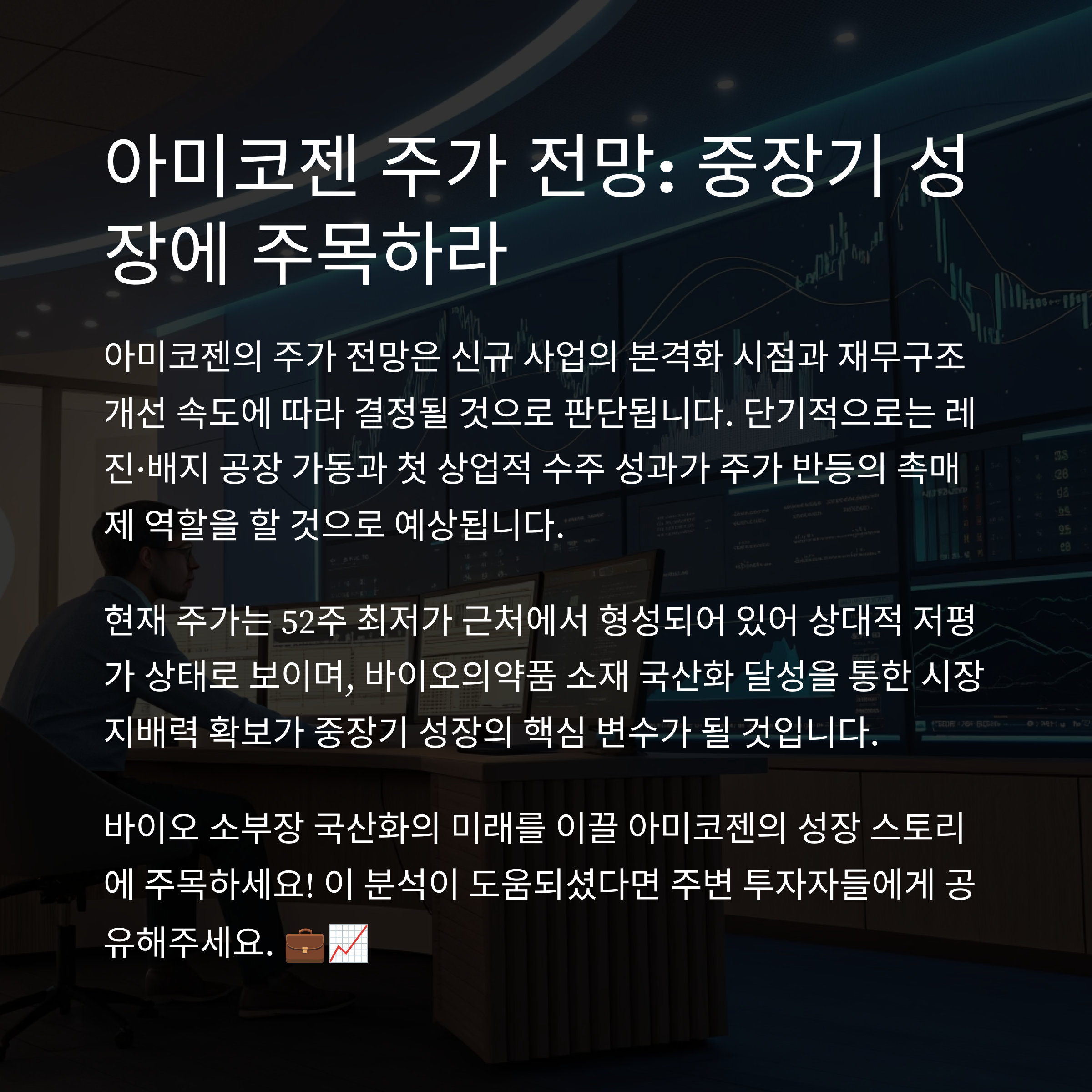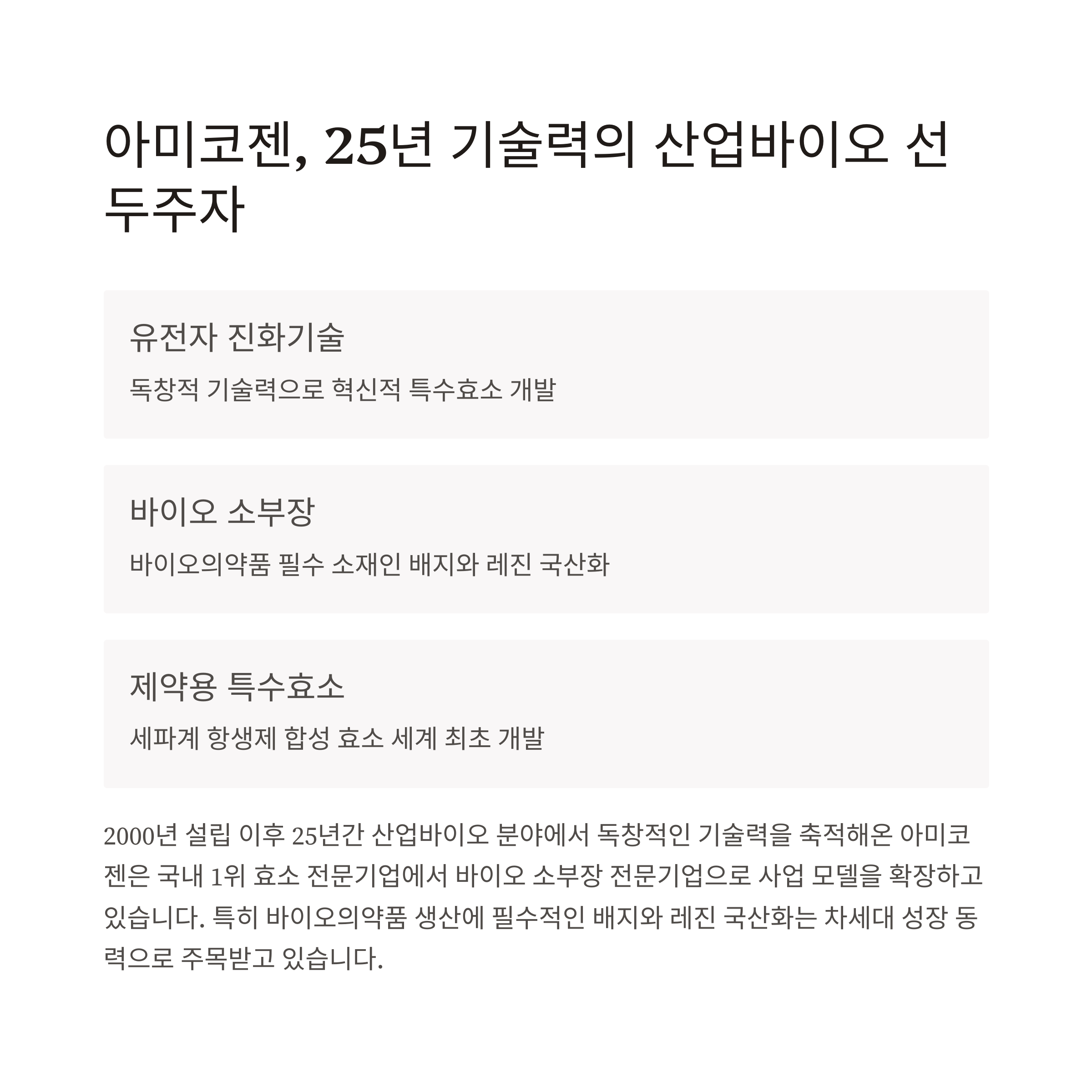 급변하는 바이오 시장에서 아미코젠은 핵심 소재 국산화와 기술 내재화를 통해 새로운 반등의 기회를 노리고 있습니다