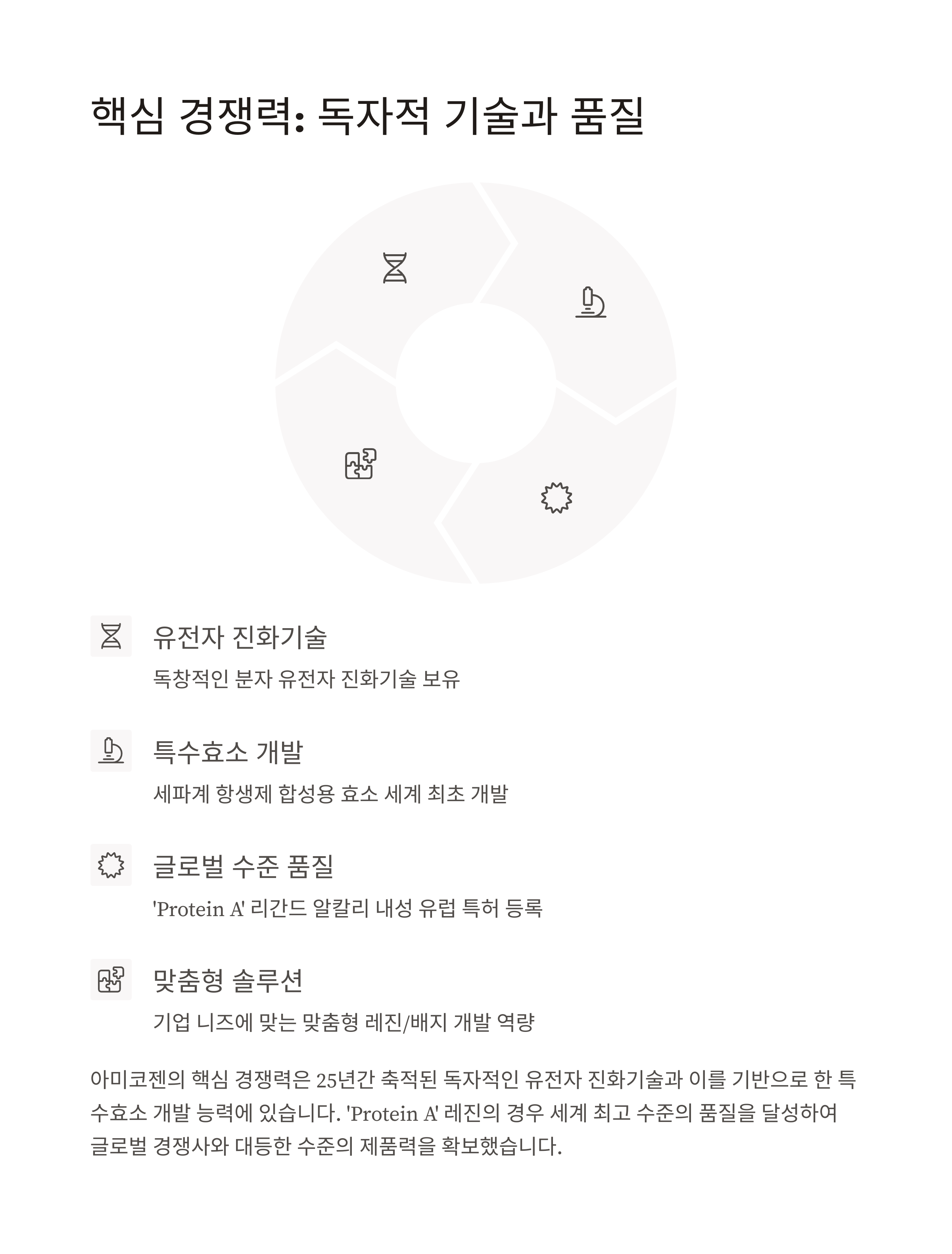 아미코젠은 기존의 특수효소 기술에서 레진, 배지, 바이오 신소재 등으로 사업을 확대해 바이오 의약품 생산 전 과정을 아우르는 수직계열화를 시도하고 있습니다.