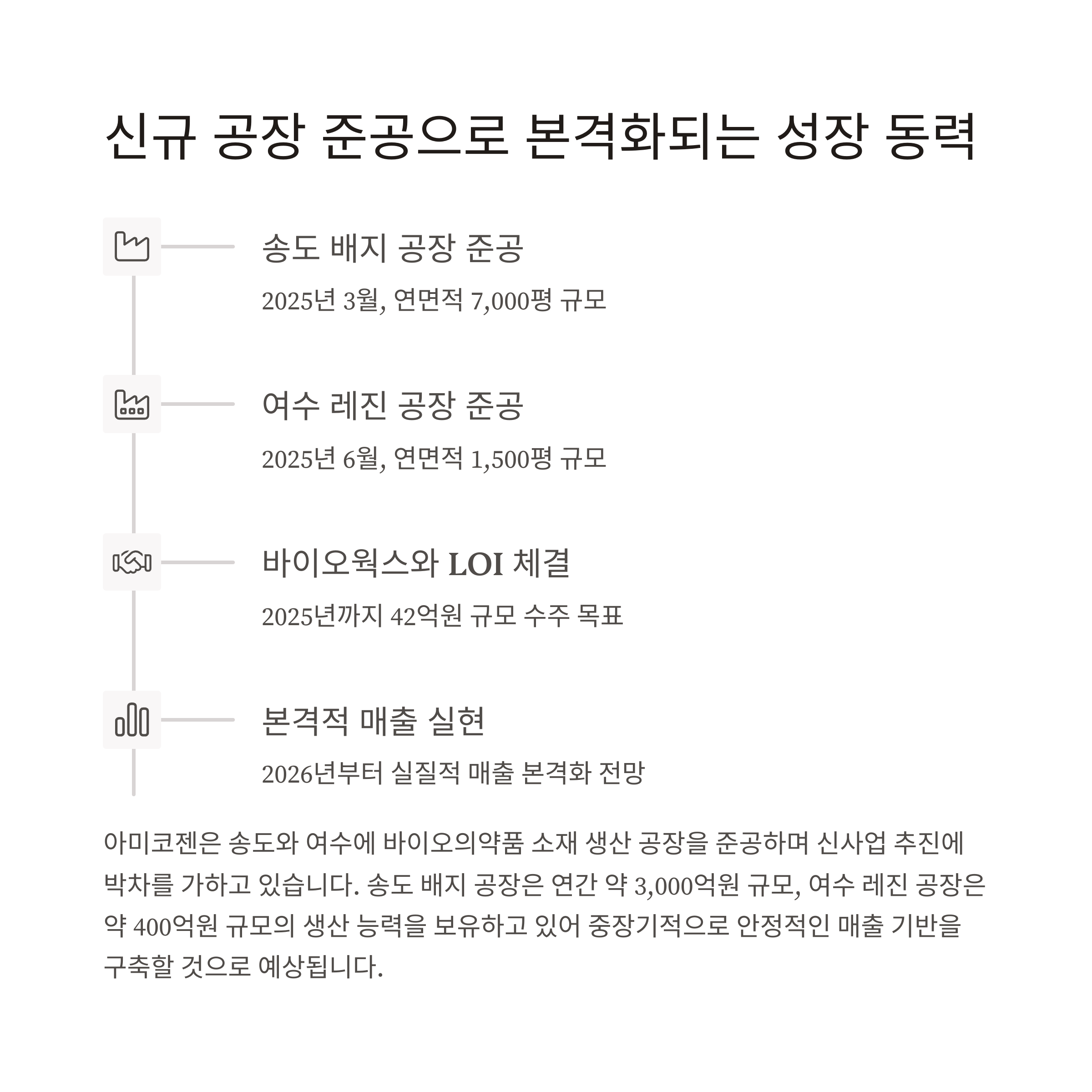 2025년 3월 송도 배지 공장, 6월 여수 레진 공장을 준공하며 생산 체계를 완비했습니다.