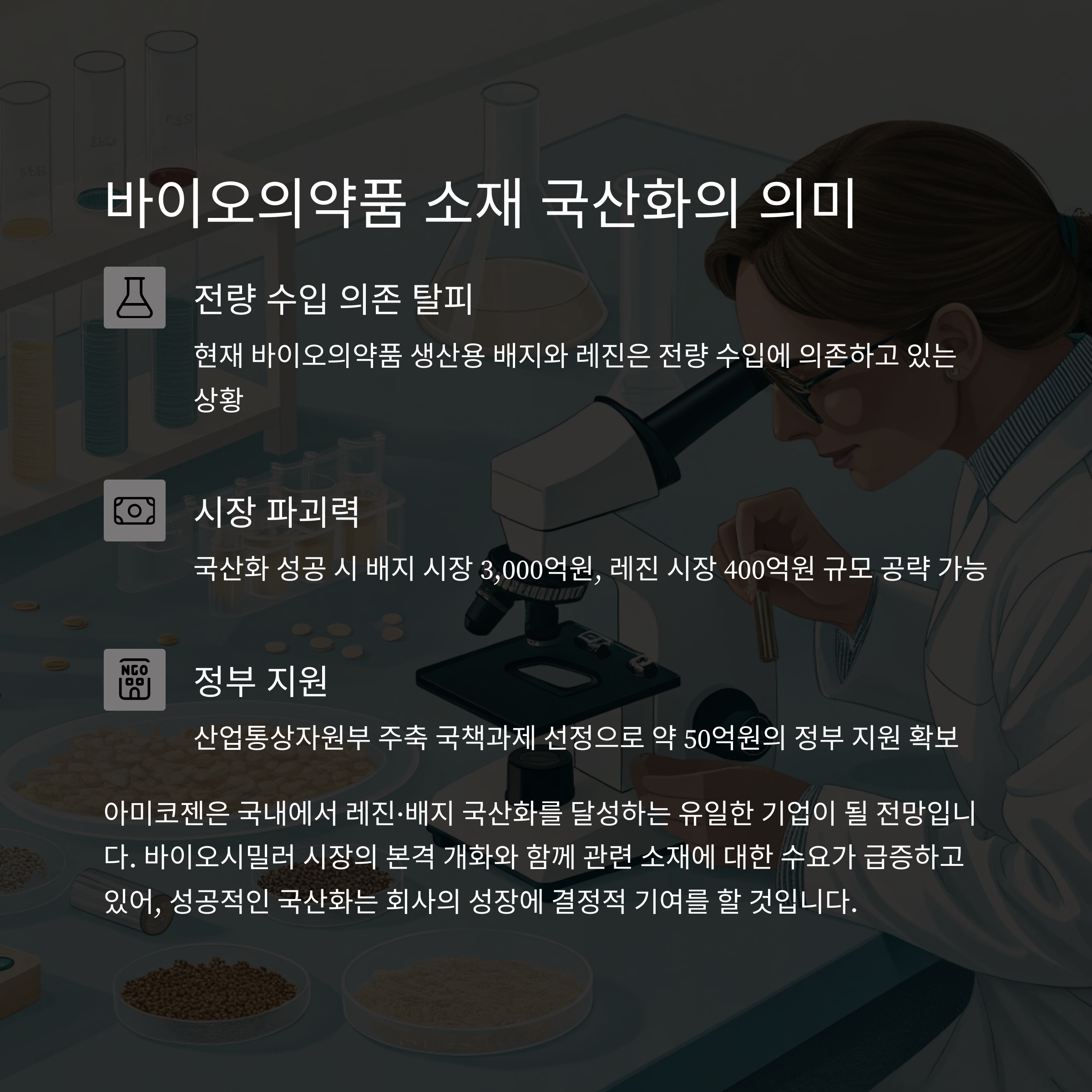 바이오 소부장 국산화 정책은 아미코젠에 유리한 외부 환경을 조성합니다.
