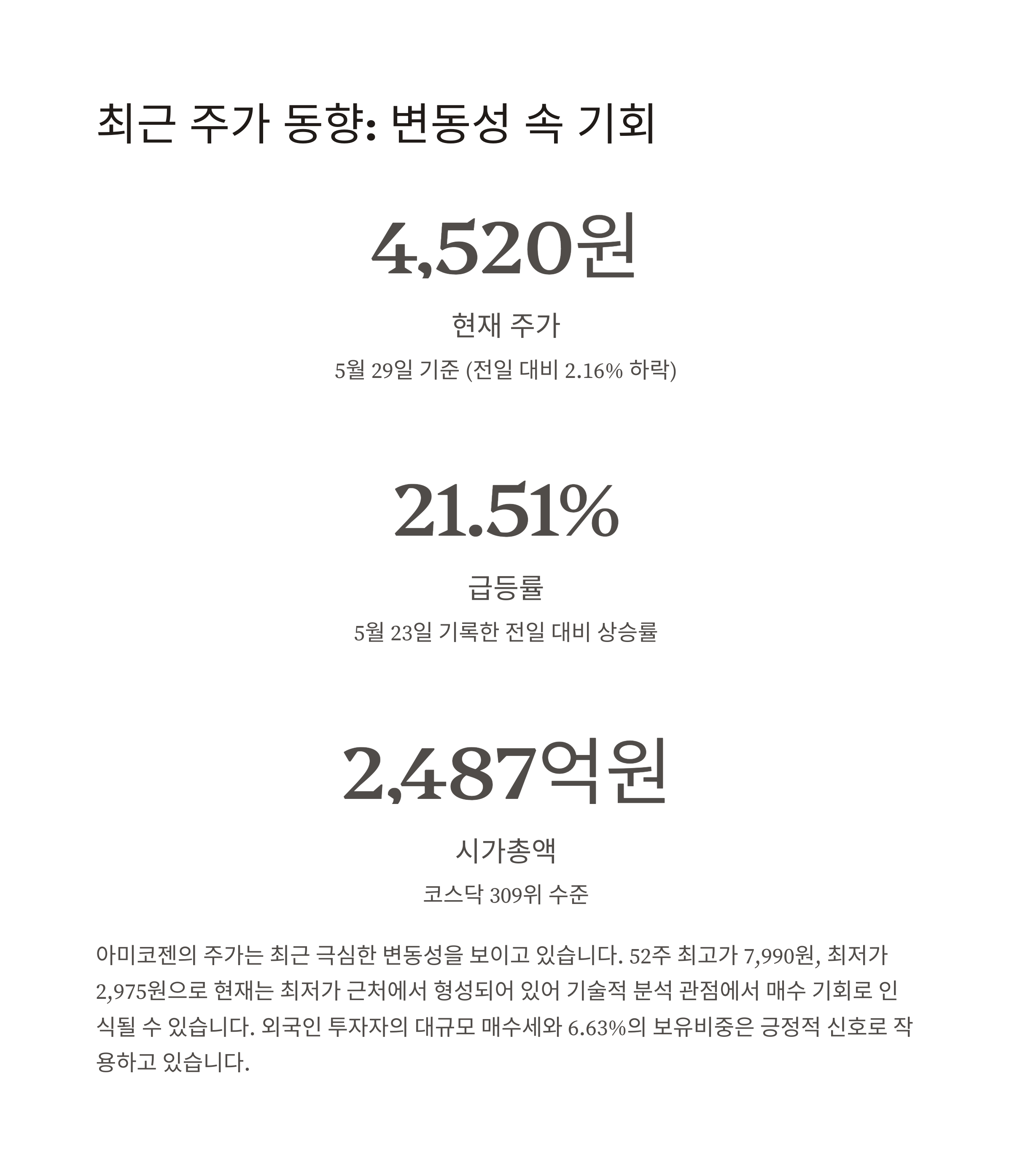 아미코젠은 기술력 기반의 바이오 소재 국산화 기업으로 중장기 성장 잠재력이 높습니다.