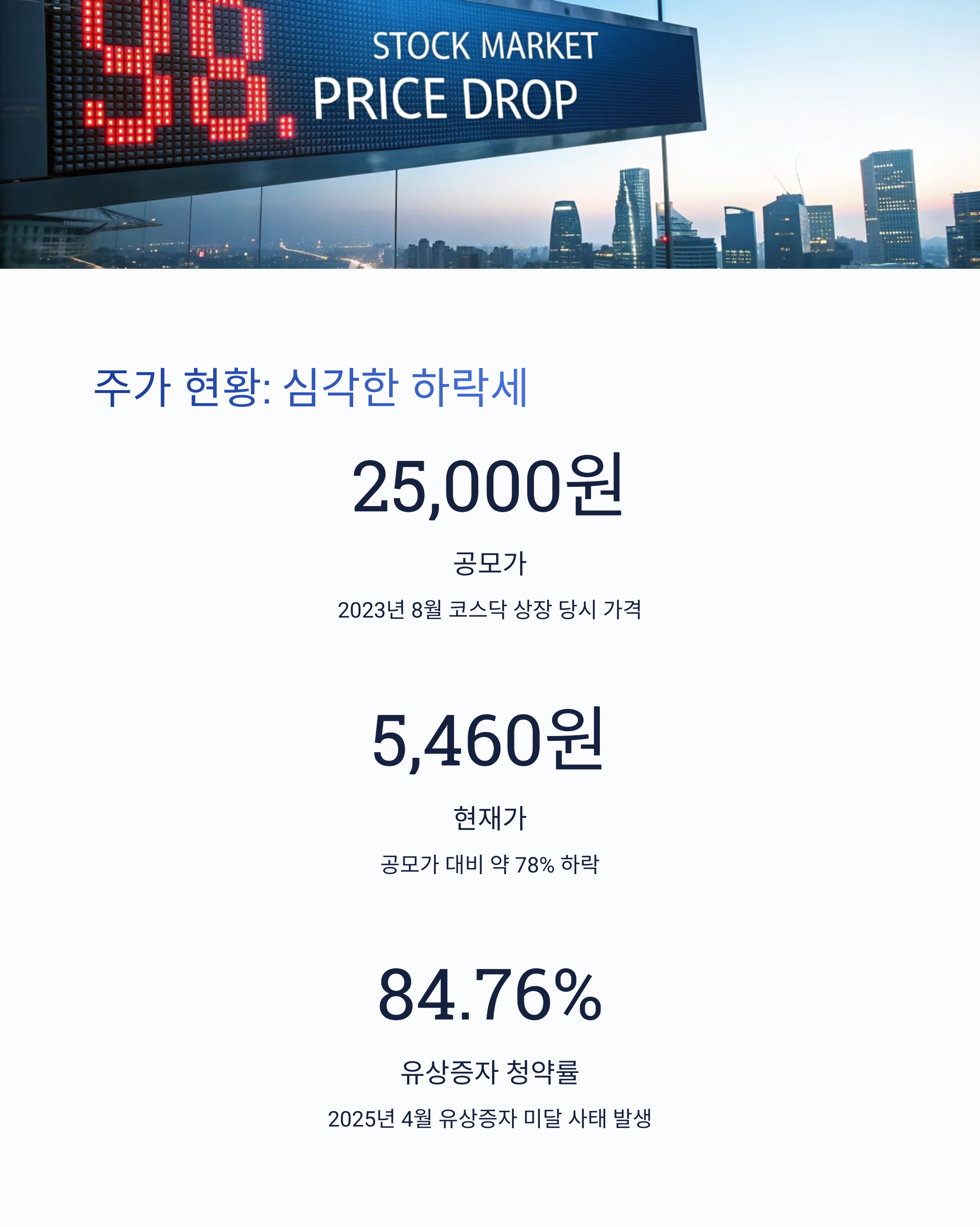 그러나 상장 이후 주가는 78% 이상 하락하며 투자자들의 신뢰를 잃고 있습니다.