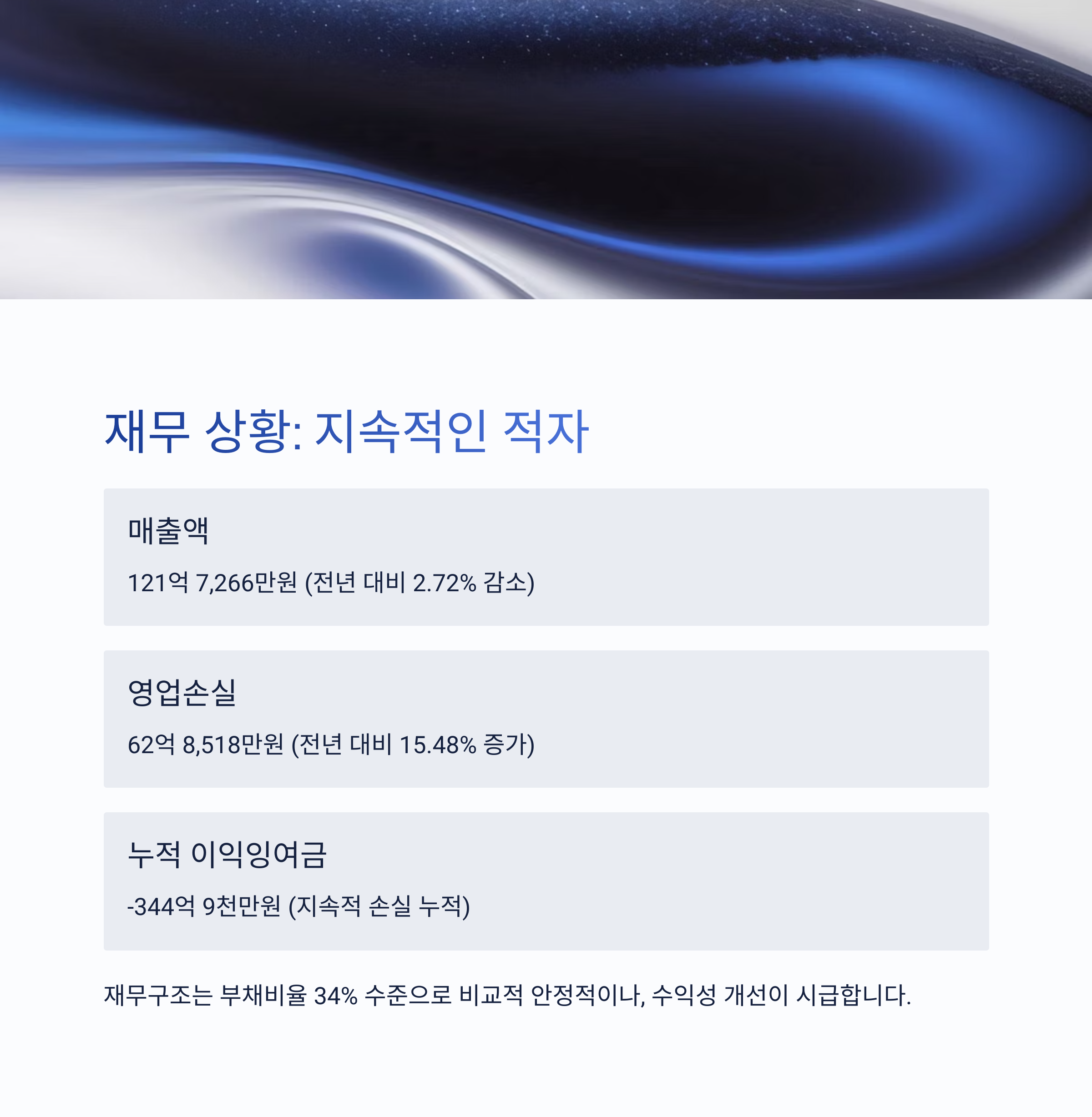 재무구조는 부채비율 34%로 안정적이나, 영업이익 전환이 절실합니다.