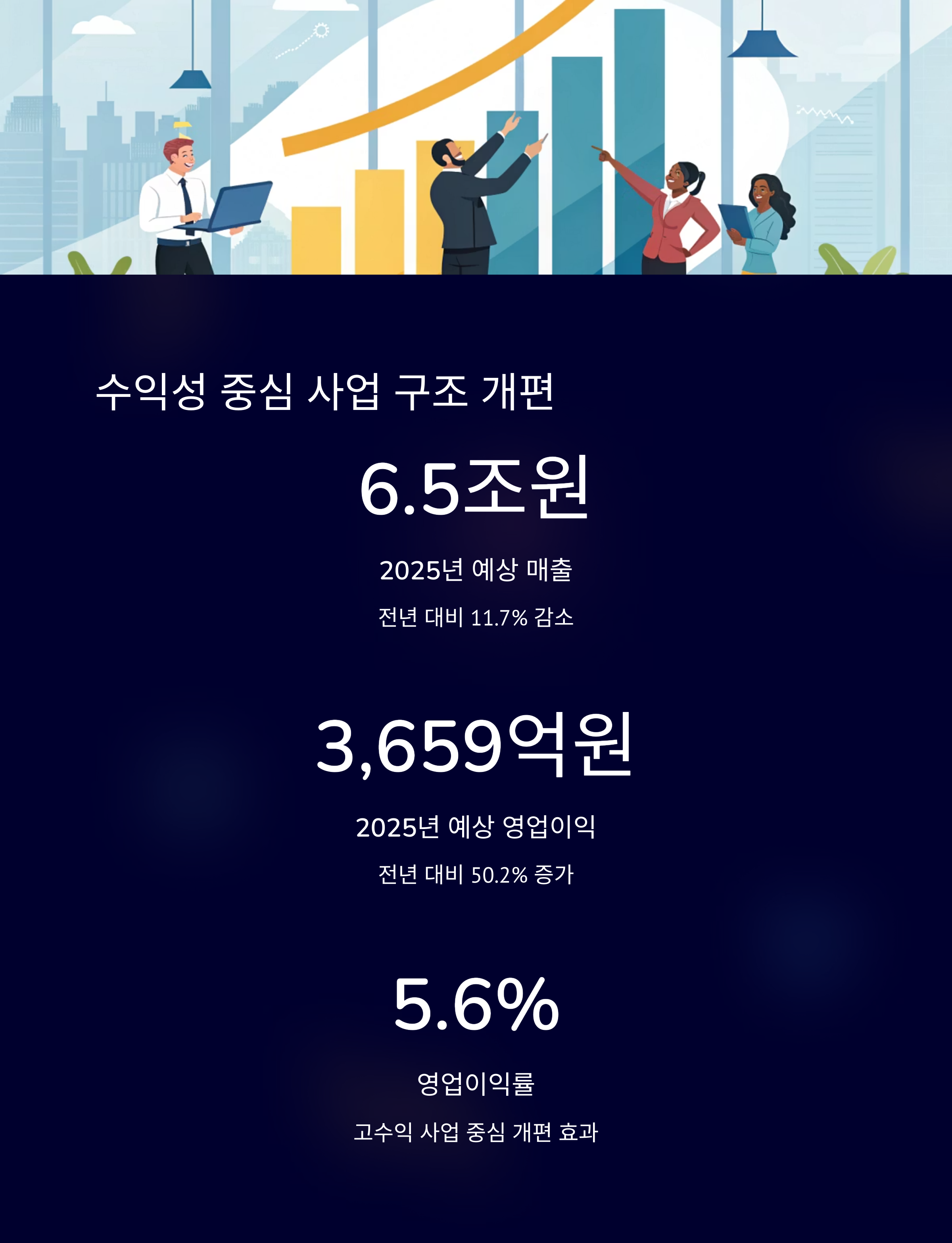 2025년 예상 실적은 매출액 감소(6.5조원, -11.7%)에도 불구하고 영업이익이 3,659억원으로 전년 대비 50.2% 증가할 것으로 전망됩니다.