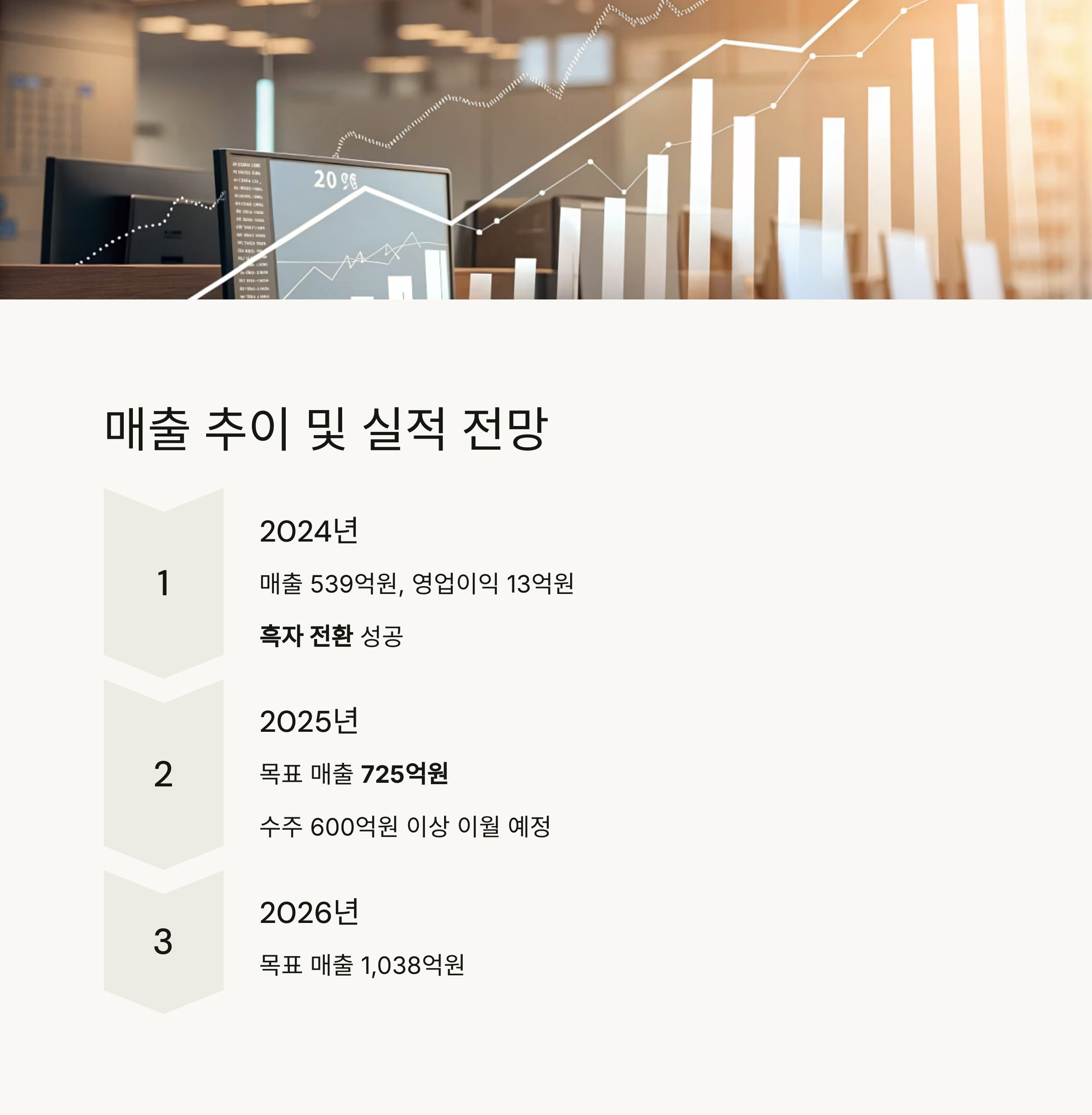 회사는 2025년 매출 725억원, 2026년 1,038억원 달성을 목표로 설정하고 있으며