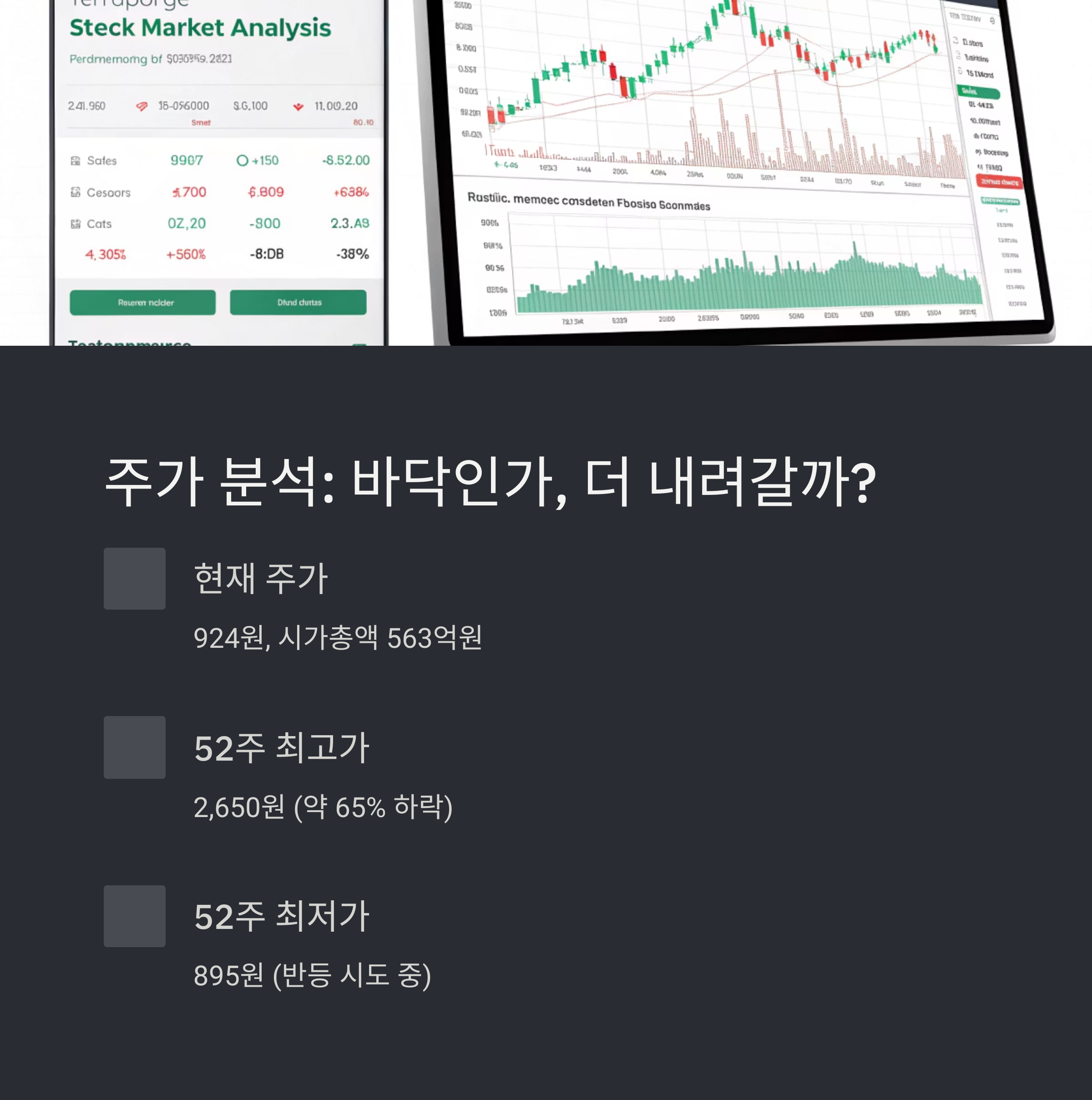 현재 이렘 주가는 924원 수준으로 52주 최고가 2,650원 대비 약 65% 하락했습니다. 시가총액은 563억원이며, 최근 3개월간 큰 변동성을 보이며 바닥을 다지는 모습입니다. 52주 최저가 895원을 찍은 이후 반등세를 시도 중이지만, 실적 개선이 동반되지 않으면 추가 하락 가능성도 열려 있습니다.