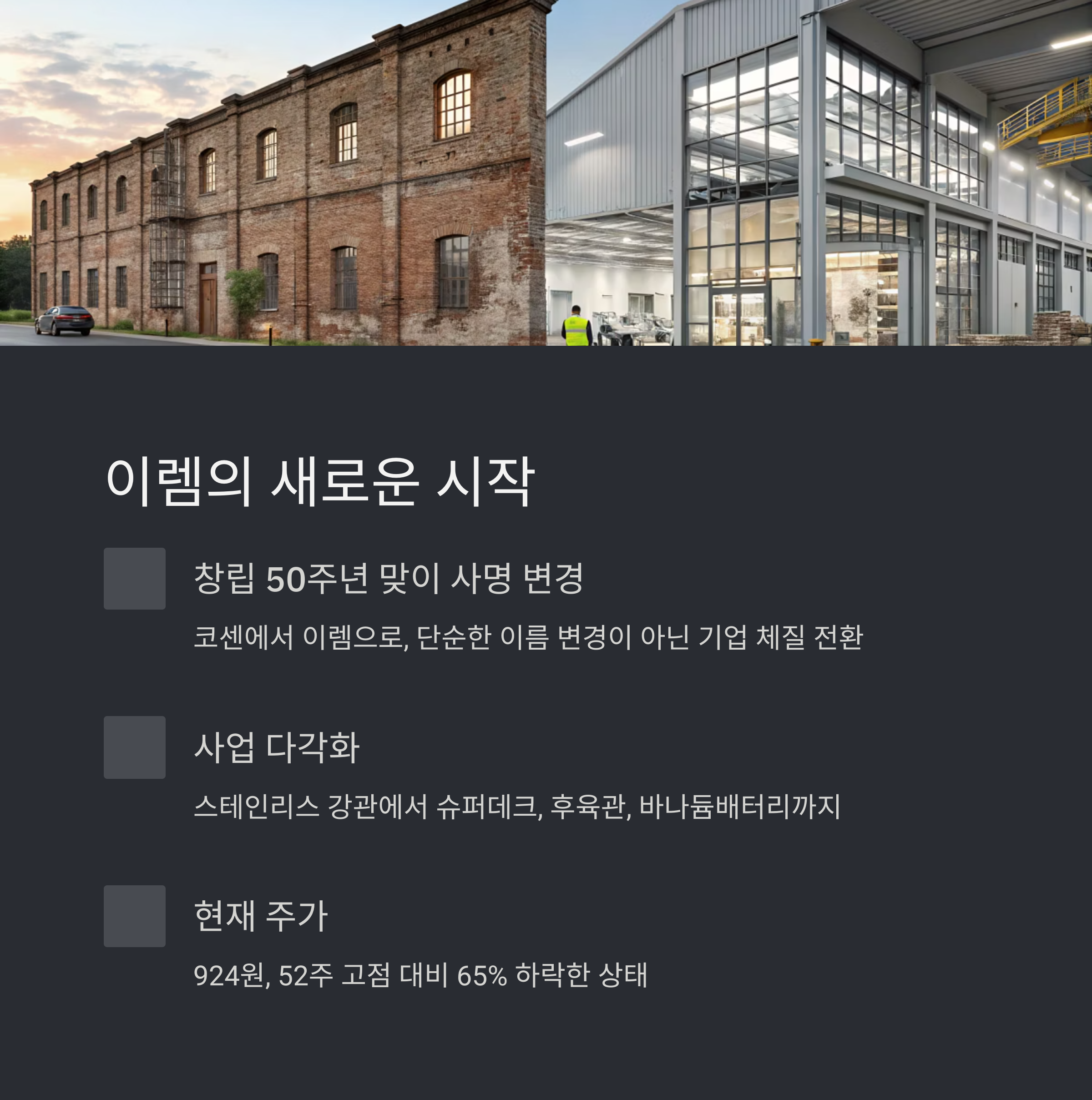 이렘(구 코센)은 2024년 창립 50주년을 맞이하며 단순한 사명 변경을 넘어 ‘기업 체질의 전환’을 선언했습니다. 과거 스테인리스 강관 제조업체라는 단일한 이미지에서 벗어나, 슈퍼데크, 후육관, ESS(에너지저장장치) 관련 바나듐배터리까지… 한마디로 "이렘 재발견의 시대"가 열린 것이죠.