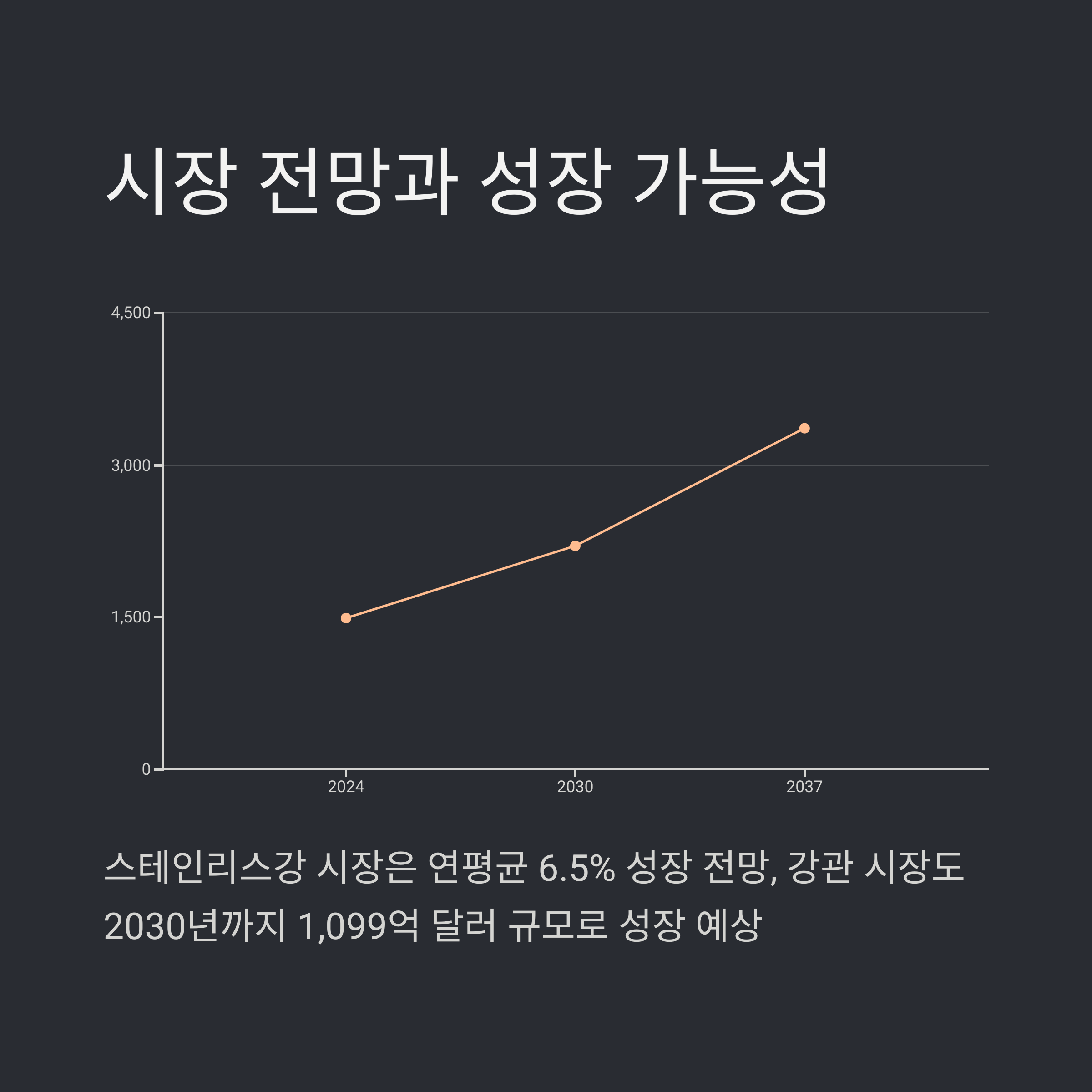 글로벌 스테인리스강 시장은 2024년 기준 1,484억 달러에서 2037년 3,364억 달러로 성장할 것으로 보이며, 연평균 성장률은 6.5%에 달합니다. 강관 시장 역시 도시화 및 인프라 교체 수요에 힘입어 2030년까지 약 1,099억 달러로 성장할 전망입니다.