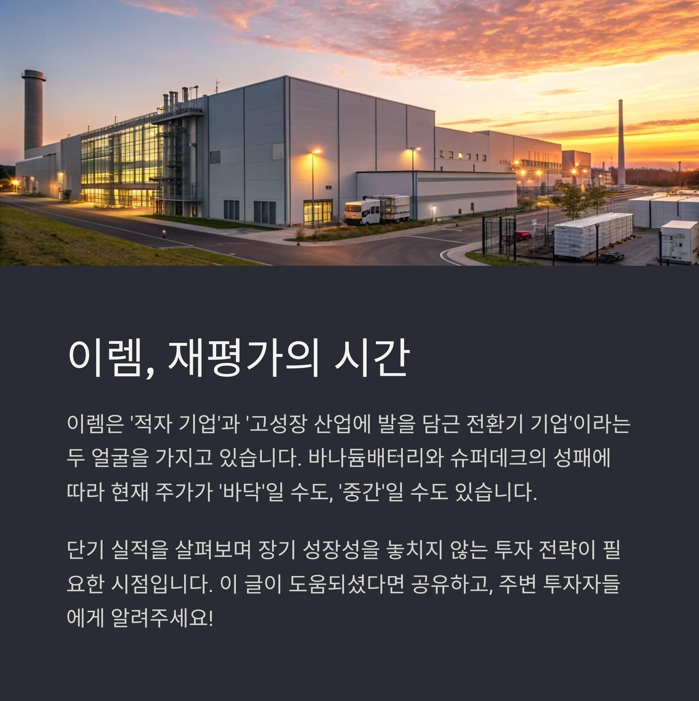 사업 구조 전환은 이미 시작되었고, 매출 성장과 고부가가치 제품군 확보는 그 증거입니다. 바나듐배터리와 슈퍼데크는 이렘 주가의 키포인트이며, 그 성패에 따라 924원이 ‘바닥’일 수도 있고 ‘중간’일 수도 있습니다.