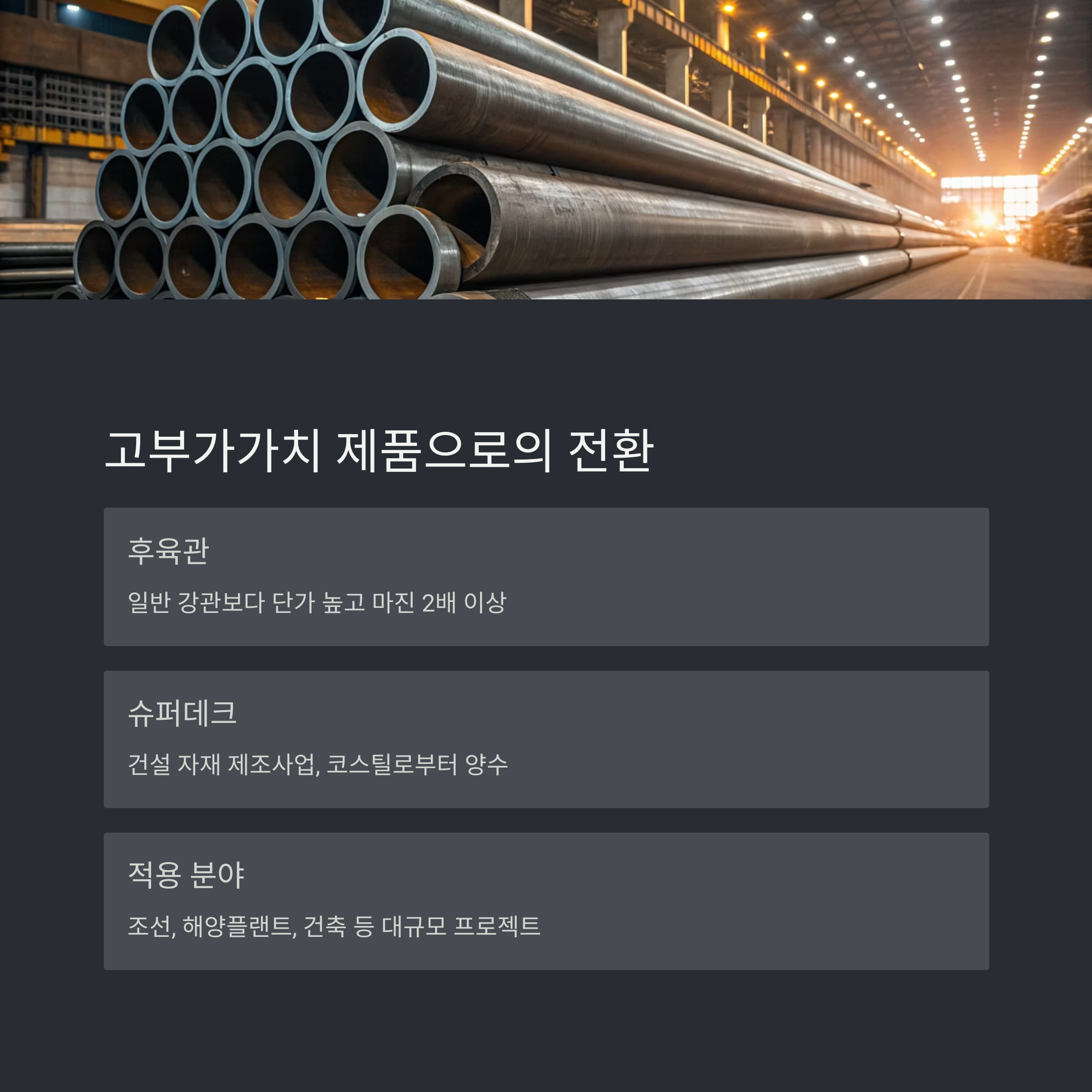 여기서 주목해야 할 점은 단순히 제품군을 늘리는 것이 아니라, ‘고부가가치 제품’으로의 전환이 이뤄지고 있다는 점입니다. 후육관은 일반 강관보다 단가가 높고, 마진도 2배 이상으로 알려져 있으며, 조선/해양플랜트/건축 분야 등 대규모 프로젝트용으로 사용됩니다.