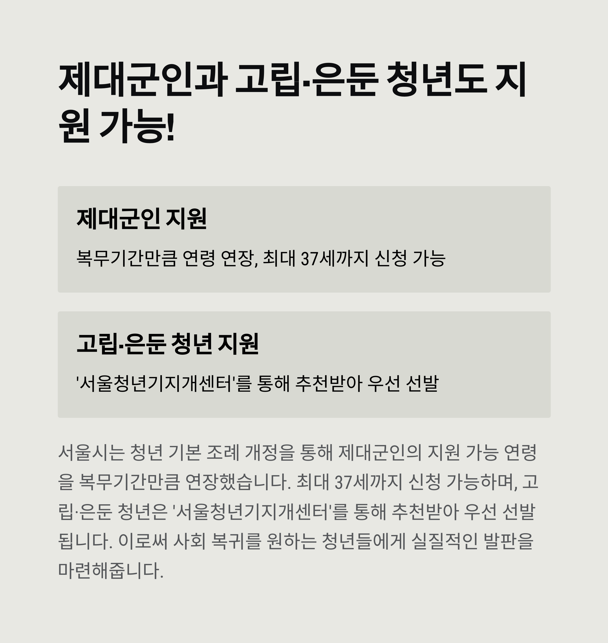 서울시는 청년 기본 조례 개정을 통해 제대군인의 지원 가능 연령을 복무기간만큼 연장했습니다. 최대 37세까지 신청 가능하며, 고립·은둔 청년은 ‘서울청년기지개센터’를 통해 추천받아 우선 선발됩니다. 이로써 사회 복귀를 원하는 청년들에게 실질적인 발판을 마련해줍니다.