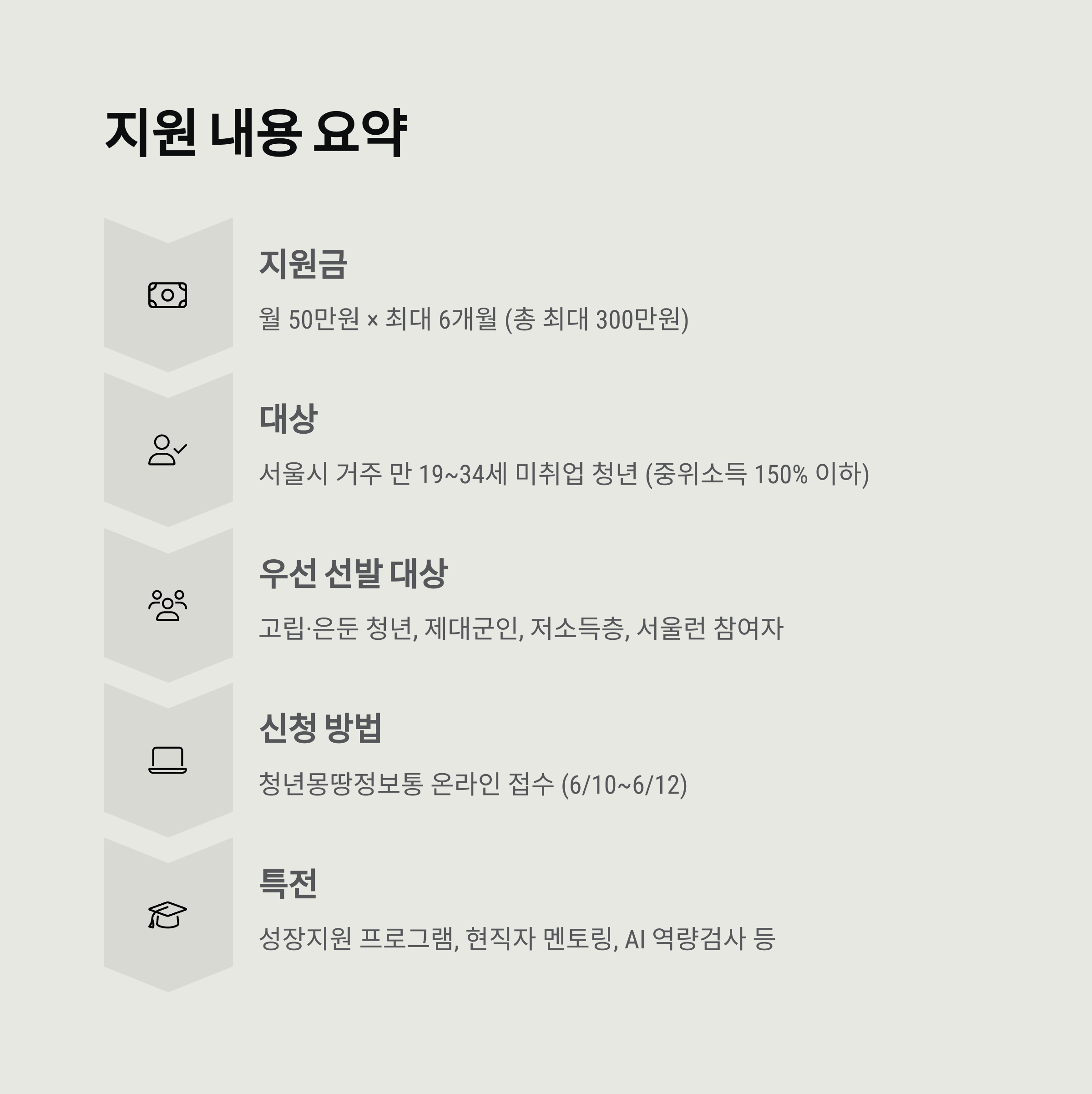 | 지원금 | 월 50만원 × 최대 6개월 (총 최대 300만원) |