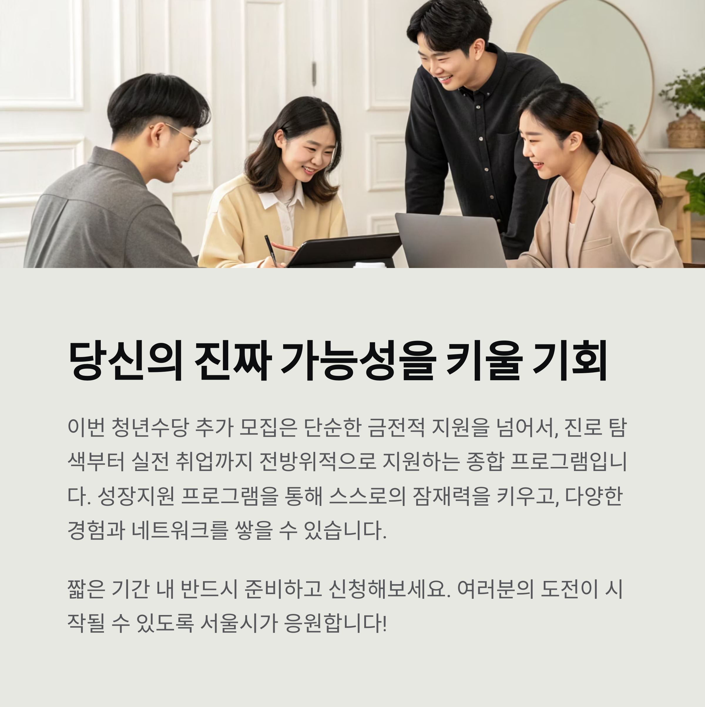 이번 청년수당 추가 모집은 단순한 금전적 지원을 넘어서, 진로 탐색부터 실전 취업까지 전방위적으로 지원하는 종합 프로그램입니다. 성장지원 프로그램을 통해 스스로의 잠재력을 키우고, 다양한 경험과 네트워크를 쌓을 수 있습니다.