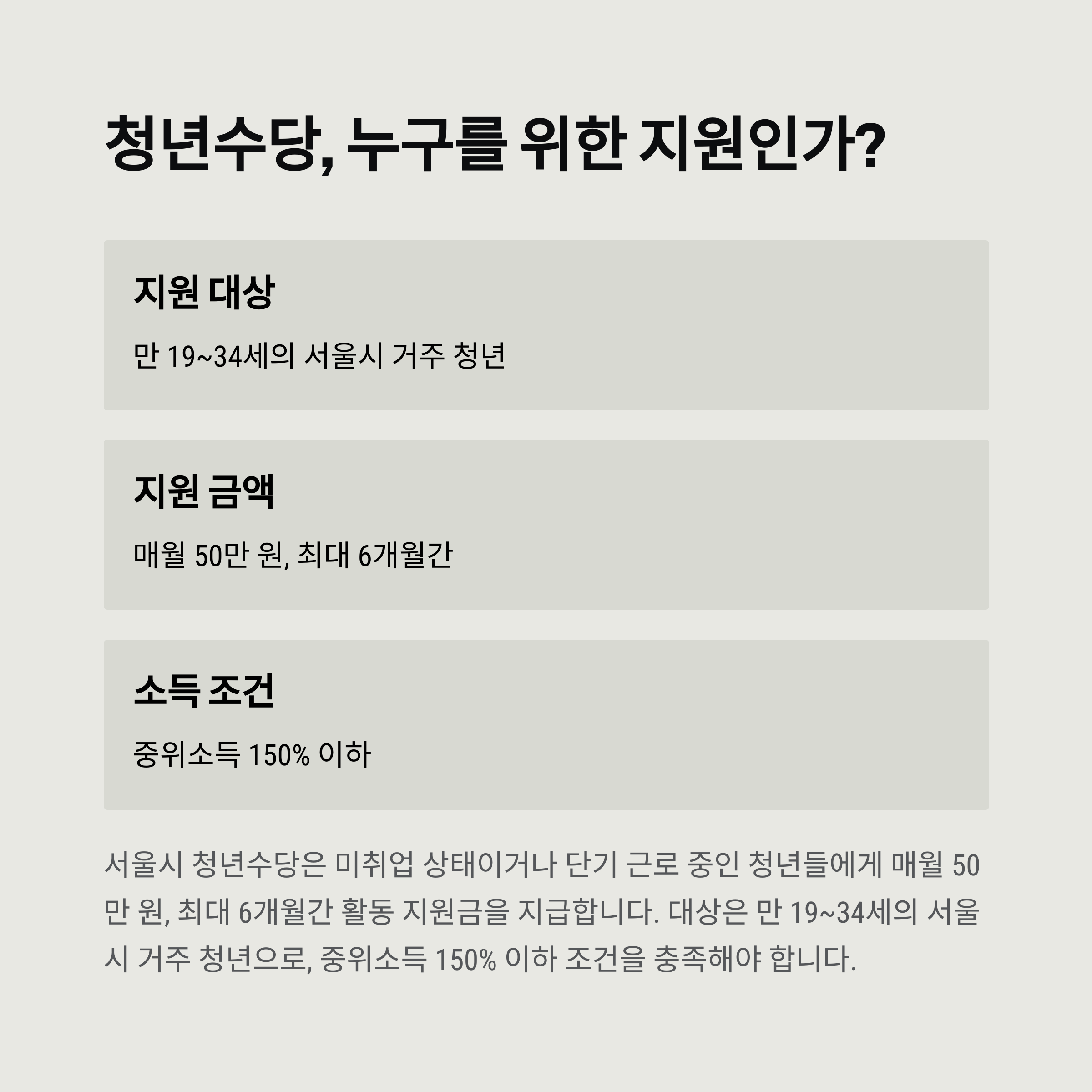 서울시 청년수당은 미취업 상태이거나 단기 근로 중인 청년들에게 매월 50만 원, 최대 6개월간 활동 지원금을 지급합니다.