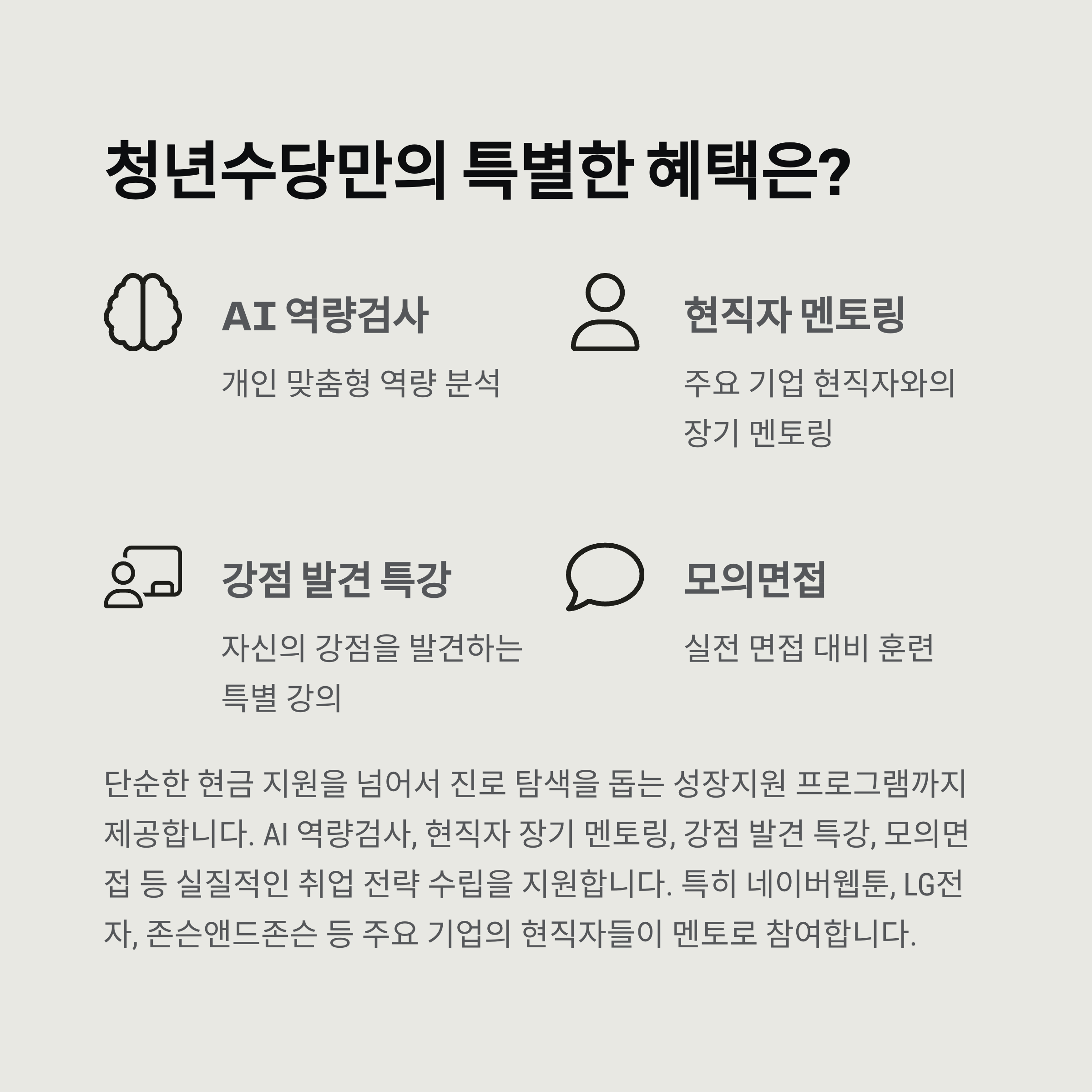 단순한 현금 지원을 넘어서 진로 탐색을 돕는 성장지원 프로그램까지 제공합니다. AI 역량검사, 현직자 장기 멘토링, 강점 발견 특강, 모의면접 등 실질적인 취업 전략 수립을 지원합니다. 특히 네이버웹툰, LG전자, 존슨앤드존슨 등 주요 기업의 현직자들이 멘토로 참여합니다.