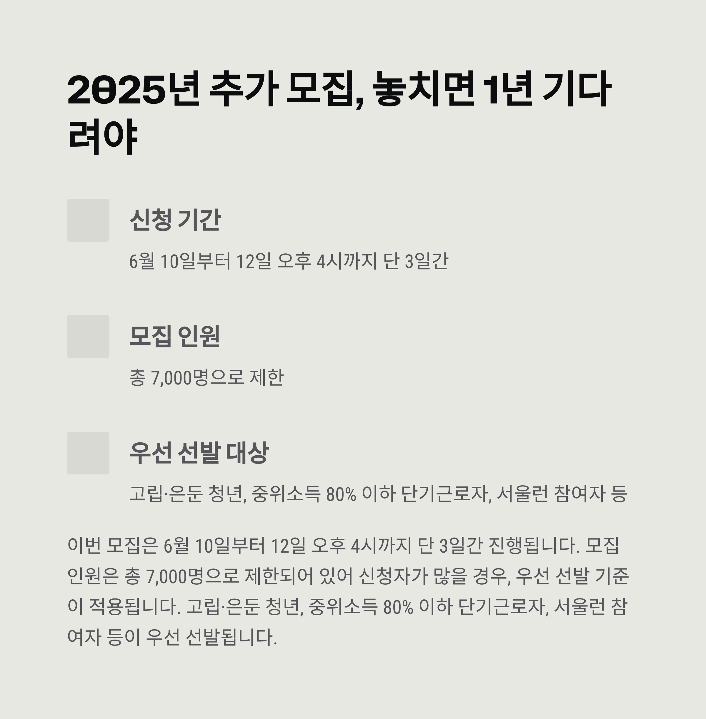 이번 모집은 6월 10일부터 12일 오후 4시까지 단 3일간 진행됩니다. 모집 인원은 총 7,000명으로 제한되어 있어 신청자가 많을 경우, 우선 선발 기준이 적용됩니다. 고립·은둔 청년, 중위소득 80% 이하 단기근로자, 서울런 참여자 등이 우선 선발됩니다.
