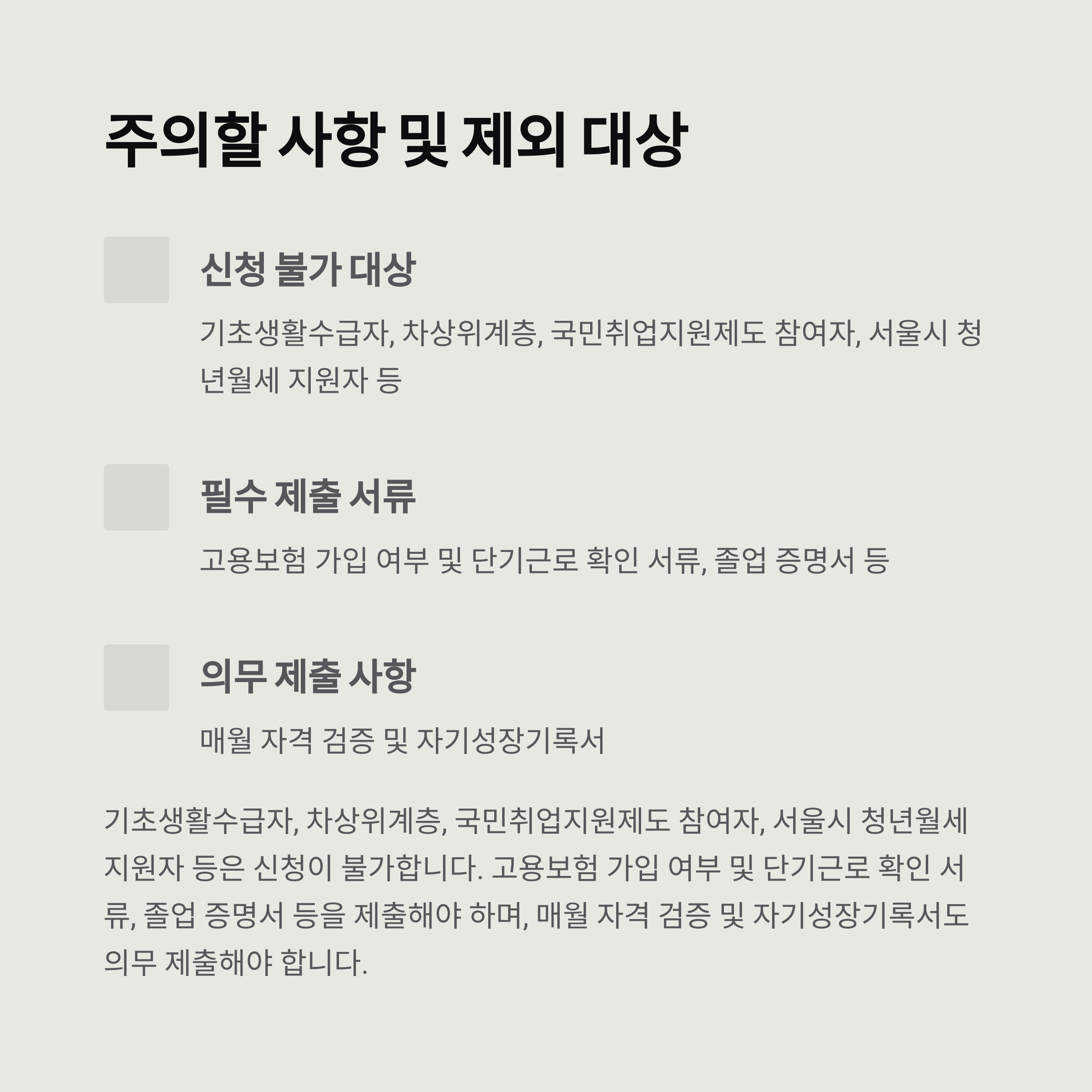 기초생활수급자, 차상위계층, 국민취업지원제도 참여자, 서울시 청년월세 지원자 등은 신청이 불가합니다. 고용보험 가입 여부 및 단기근로 확인 서류, 졸업 증명서 등을 제출해야 하며, 매월 자격 검증 및 자기성장기록서도 의무 제출해야 합니다.