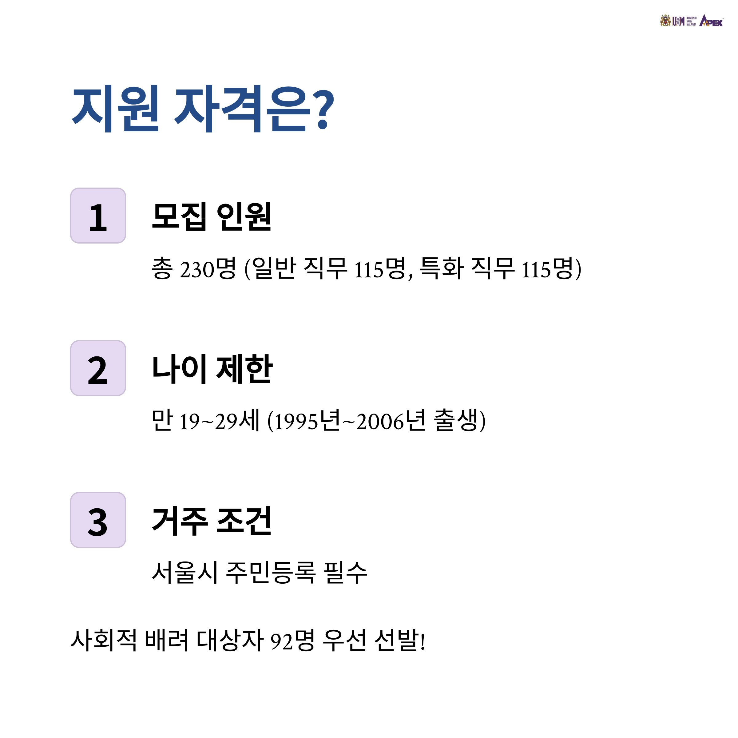 2025년 여름, 서울시는 총 230명의 청년을 모집합니다. 이 중 절반인 115명은 일반 직무, 나머지 115명은 특화 직무로 나누어 선발합니다.