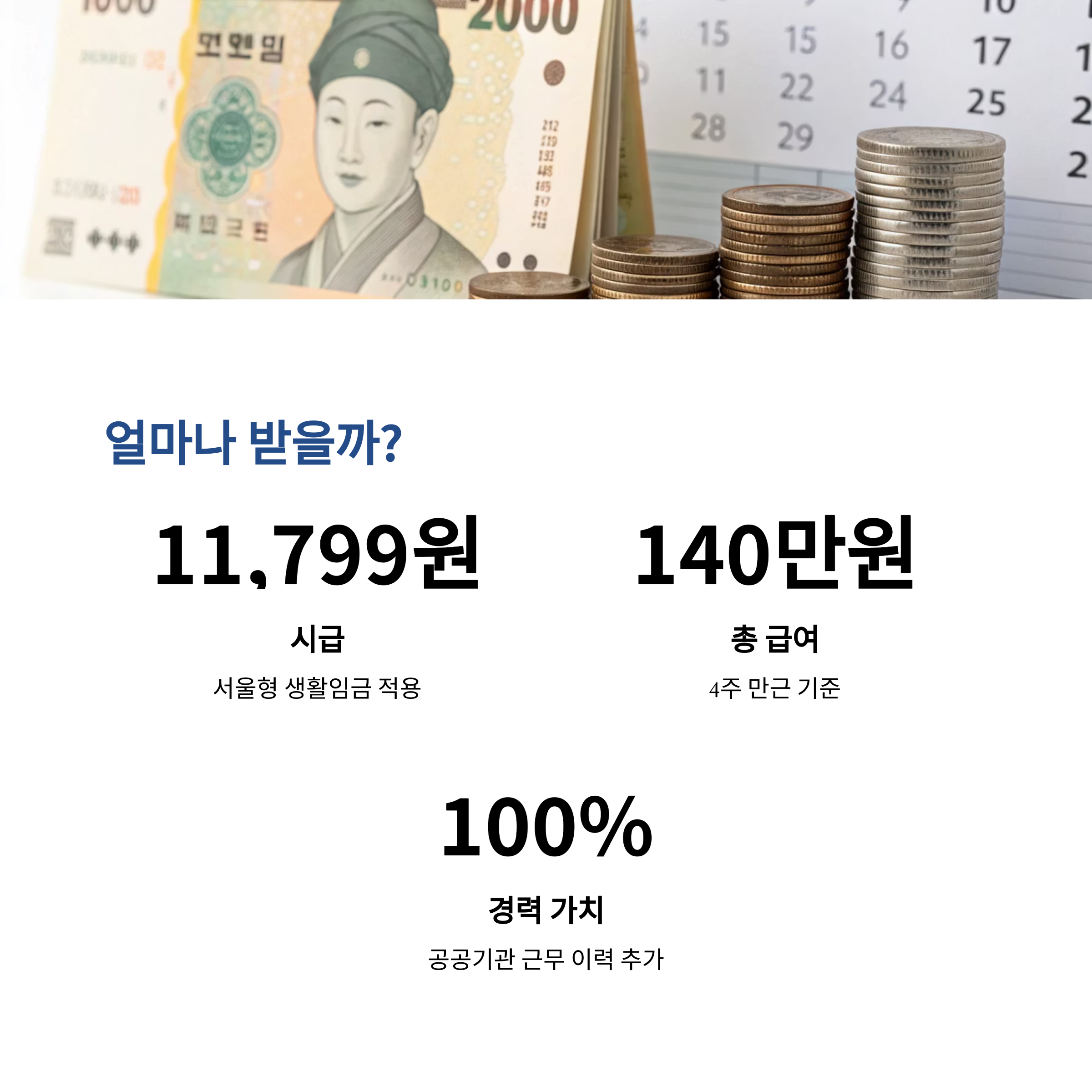 이번 청년 아르바이트는 서울형 생활임금(시급 11,799원)이 적용됩니다. 하루 5시간, 주 5일, 총 4주 만근 시 약 140만 원의 급여를 받을 수 있습니다. 여기에 추가 수당은 없지만, 공공기관 근무 이력은 향후 이력서에도 도움이 됩니다.