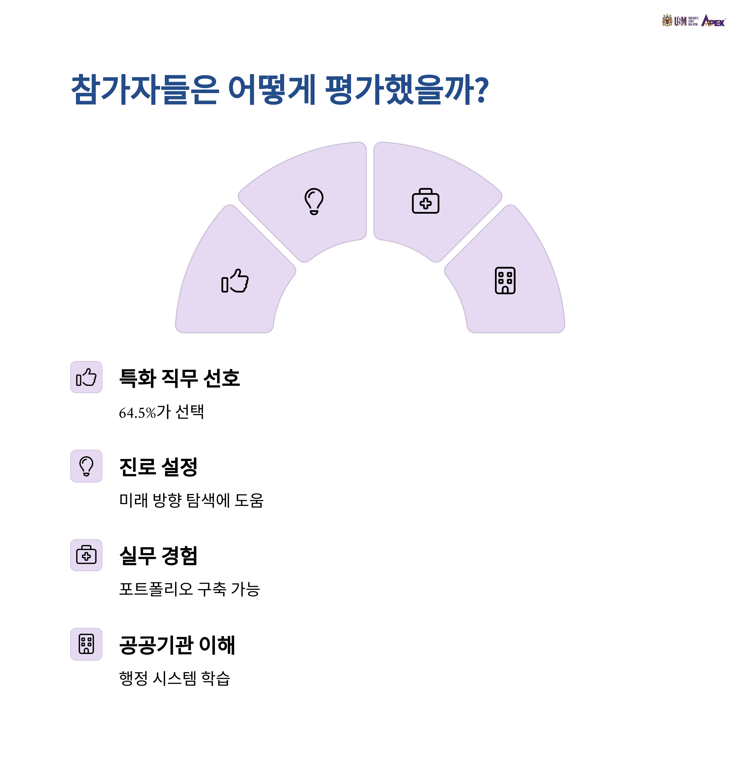 지난 동계 프로그램 참가자 중 64.5%가 ‘특화 직무 선호’를 선택했습니다. 또한 공공기관에 대한 이해가 높아졌고, 진로 설정에도 도움이 되었다는 후기도 많습니다. 특히 전공과 관련된 직무에 참여한 청년들의 경우, 실무 경험과 포트폴리오까지 챙길 수 있어 높은 만족도를 보였습니다.